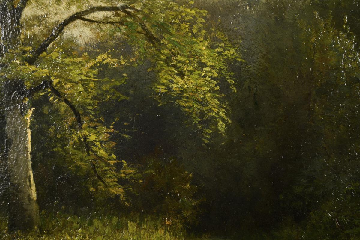 Warm sunshine over the small body of water with the deer near the bank. Slight traces of age.