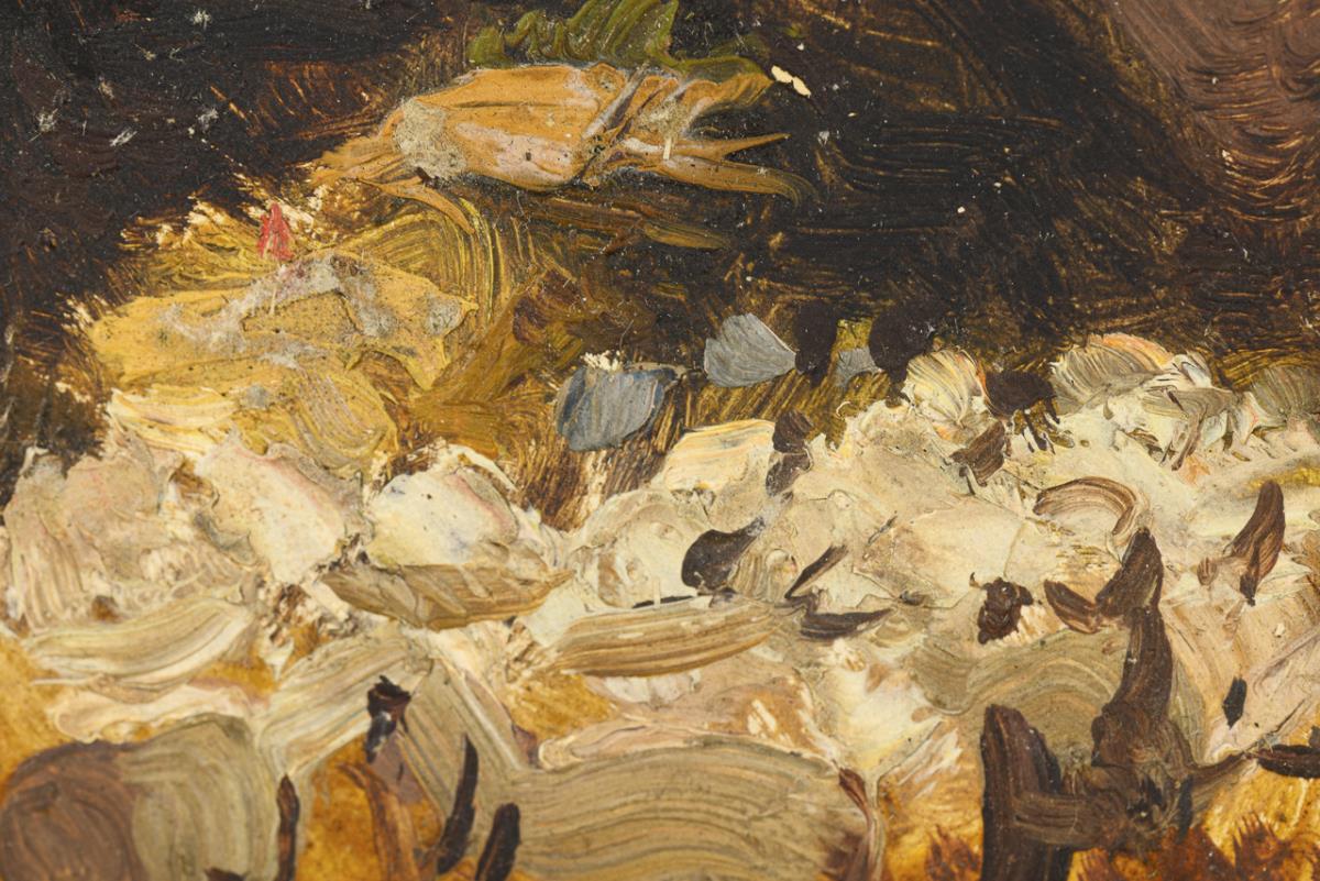 Small oil sketch with a flock of sheep in a stable