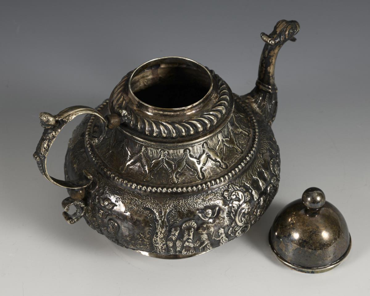 Bellied shape with rich figurative reliefs and animal head snaps. Solder marks on the underside of the stand ring.
