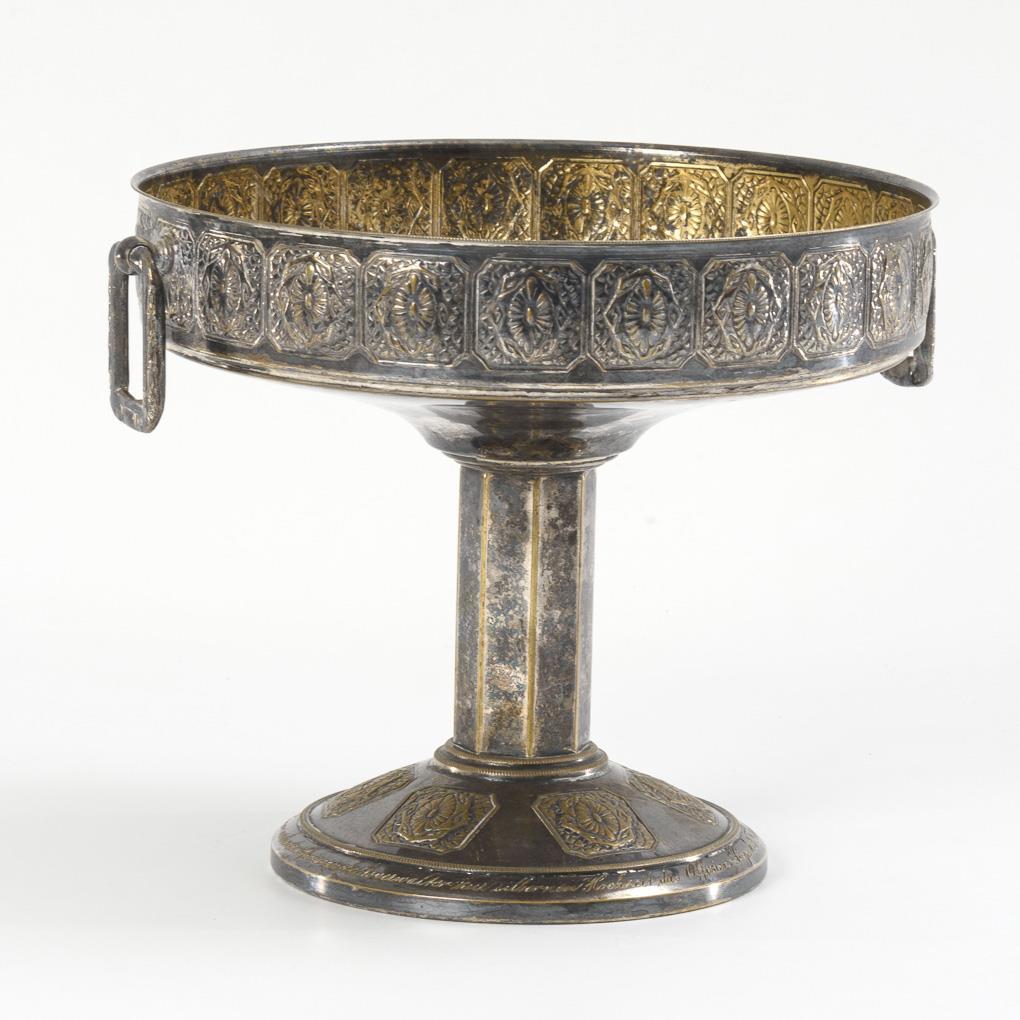 Centerpiece with embossed rosettes on the foot and on the wall as well as 2 handles. Dedication at the foot: "To his deserving dining establishment administrator on his silver wedding anniversary, the officer corps k. 3. Feldart.-Rgts. Prinz Leopold". Brown, minor scratches.