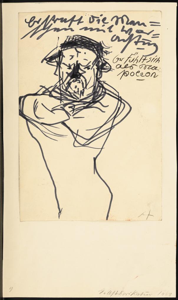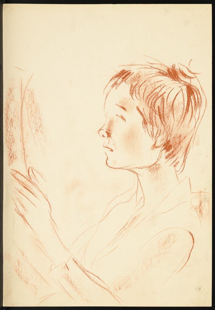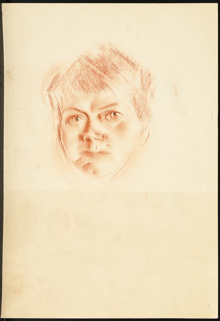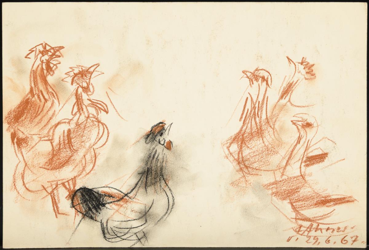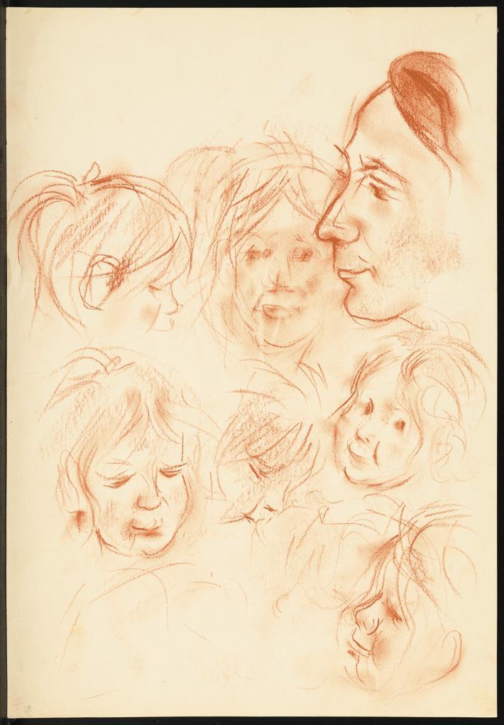 4 sheets with studies: study sheet with woman's head and 6 children's heads: red chalk drawing, unsigned, sheet: 42 x 29.6 cm, verso portrait of a boy | "Self-caricature": felt-tip pen and charcoal drawing, pencil monogram, sheet: 35 x 21.5 cm, 1963 | Woman with baby carriage on a park bench: Charcoal drawing with color accents, charcoal signature, 1961, sheet: 29.6 x 42 cm, verso portrait of a boy, red chalk drawing | Sketch with chickens: red chalk and charcoal drawing, red chalk signature, [19]67, sheet: 21 x 29.7 cm, verso sketch of a man in profile, charcoal drawing.