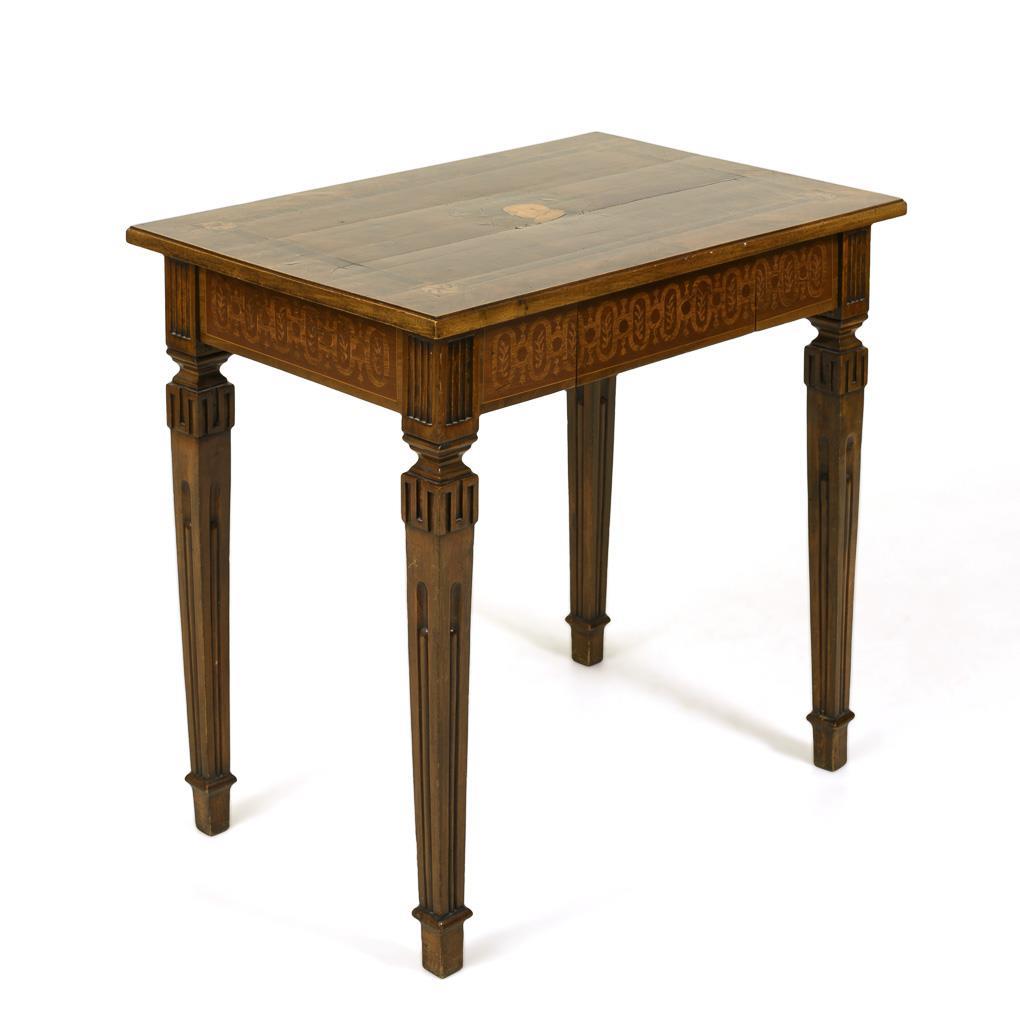 Elegant rectangular coffee table on 4 tapered legs with fluted profile, smooth frame with hidden drawer; decorated with antique-style ribbon inlays and marquetry of an Asian-style male head in profile. Signs of age/use, dry cracks, restored using old parts.