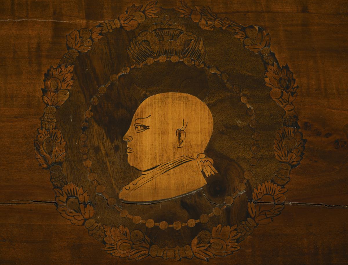 Walnut and other woods veneered, marquetry. Approx. 76 x 85 x 55.5 cm.