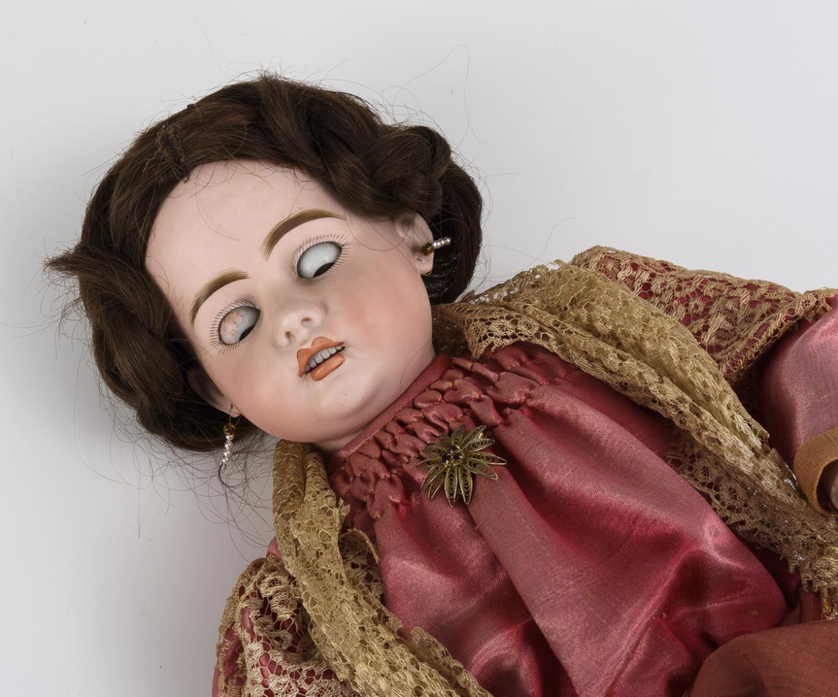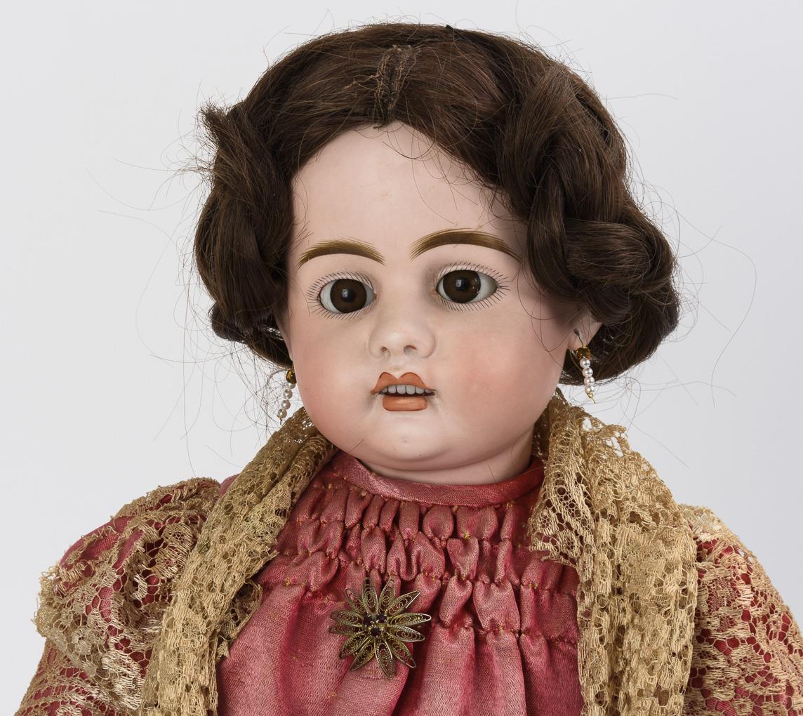 Cranked head, brown sleeping eyes, earrings, brown human hair wig. 11-piece articulated body. Purple silk dress, younger light leather boots. Restored chipping to the back of the head, 1 tiny chip to the earlobe. Hands with traces of repair.
