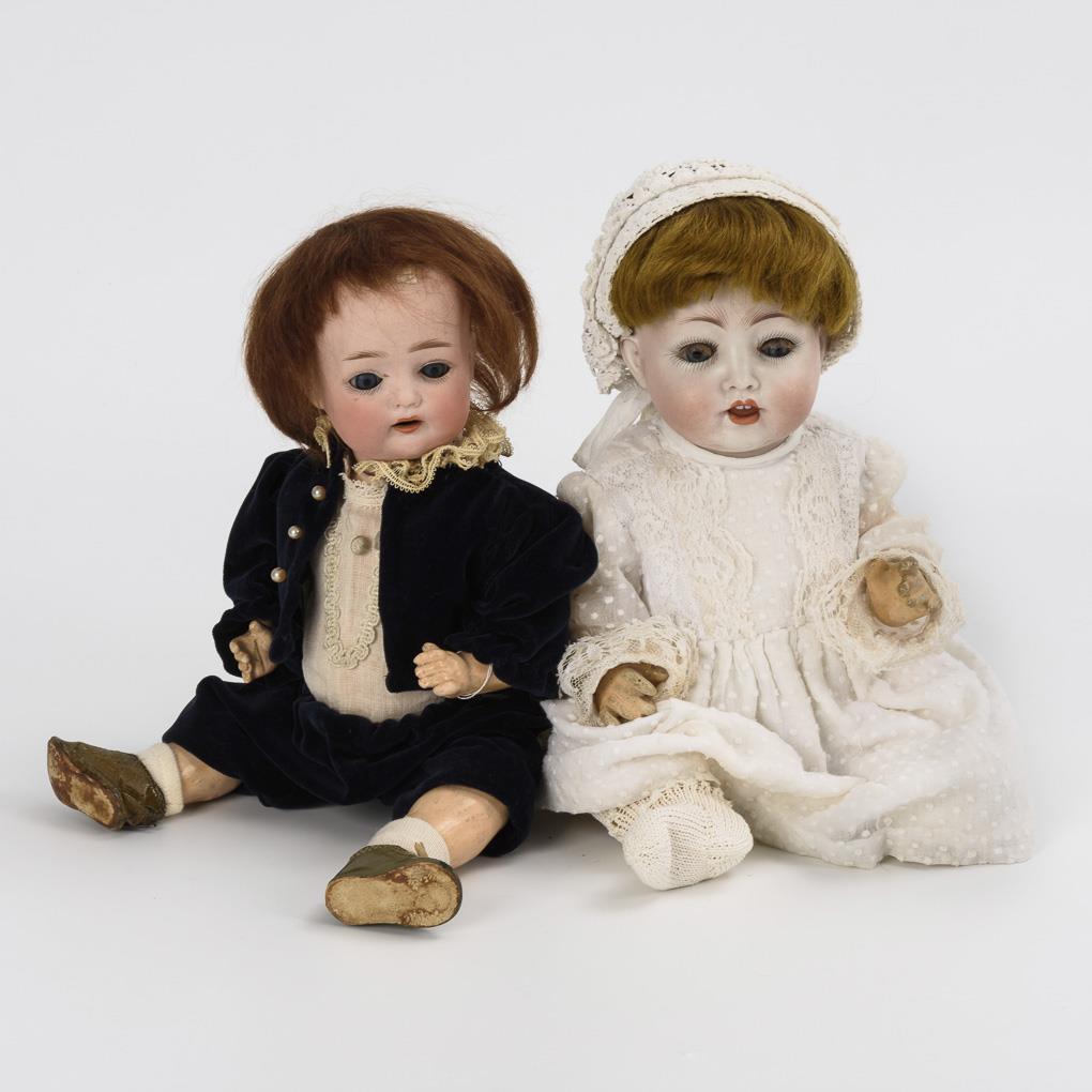 Both with crank head, blue sleeping eyes, mohair wig and 5-part sitting baby body. 1x character baby Hertel, Schwab & Co, for Koenig and Wernicke with white dress and hood. Left foot repaired. / 1x P. St. marked, with simple cardboard body and supplemented wig, in dark blue velvet suit and old oilcloth shoes. Heads x-rayed: without defects.