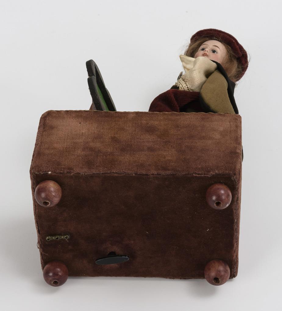 Porcelain head puppet dressed as a painter with easel. On a pedestal with brown velvet cover and musical mechanism. Plays music, moving head and hands. Intact work with fixed key. Slight signs of age.