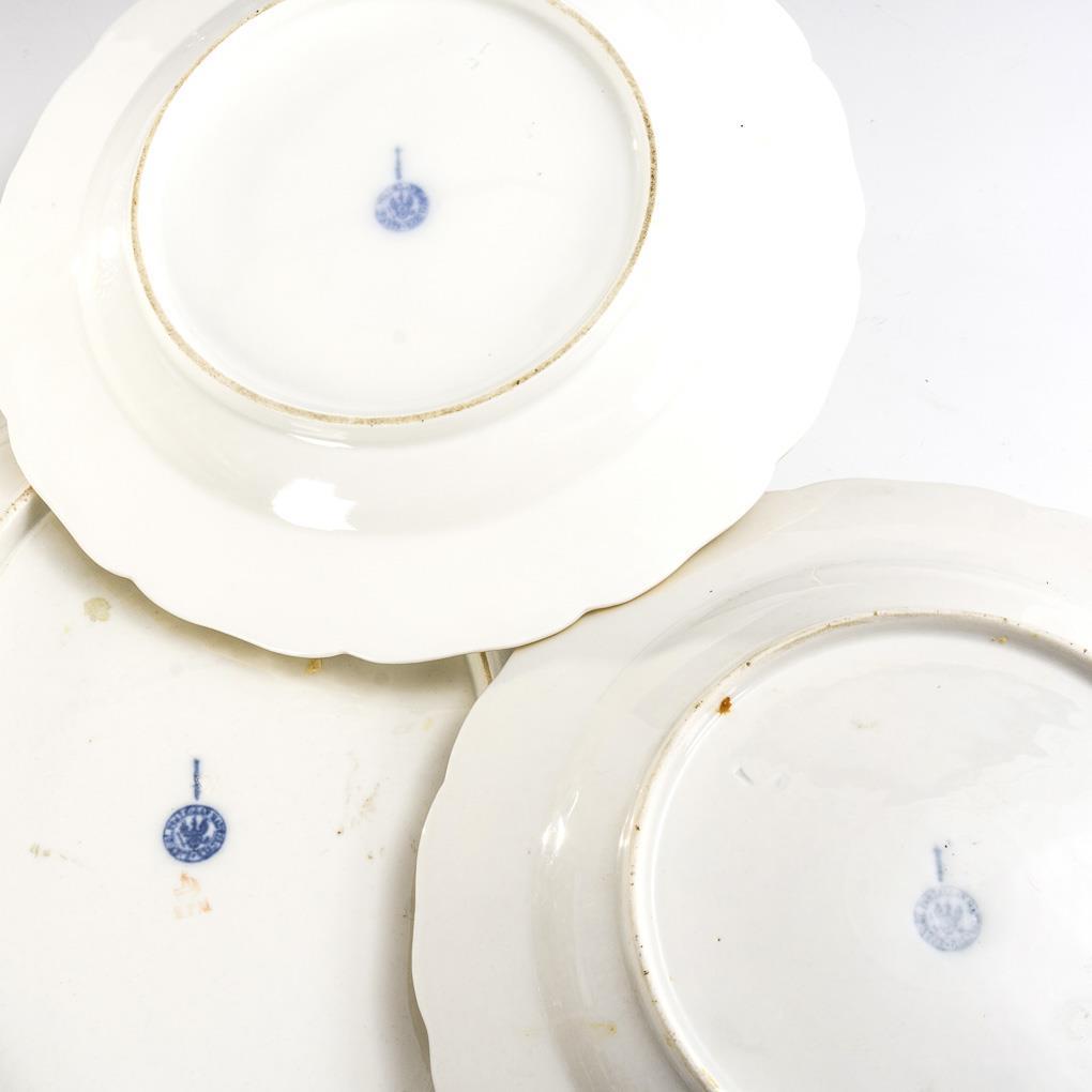 Polychrome painted, decorated in gold. 2 plates (Ø 22 cm), 1 bowl (L 32 cm).