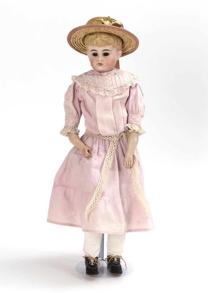 Chest head, brown glass eyes, blond short hair, leather body with bisque arms and splinted legs. Pink dress, black oilcloth shoes. No defects visible on the head, right hand restored.
