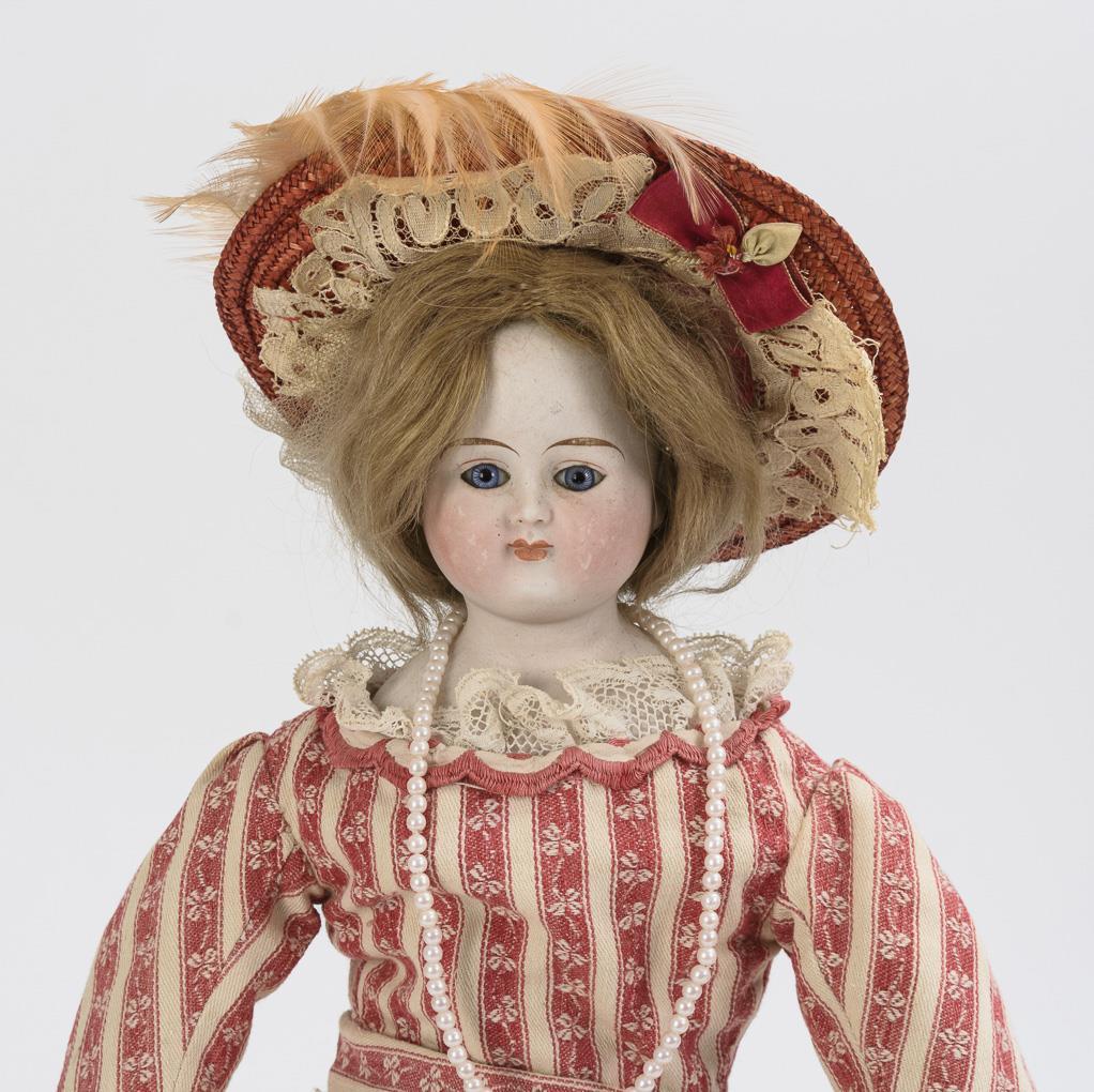 Closed, light-colored chest head ("Bold head") with fixed blue glass eyes and blond mohair wig. Slender leather body. Striped dress, pearl necklace, red straw hat. Head without visible defects, body with signs of age and repairs.