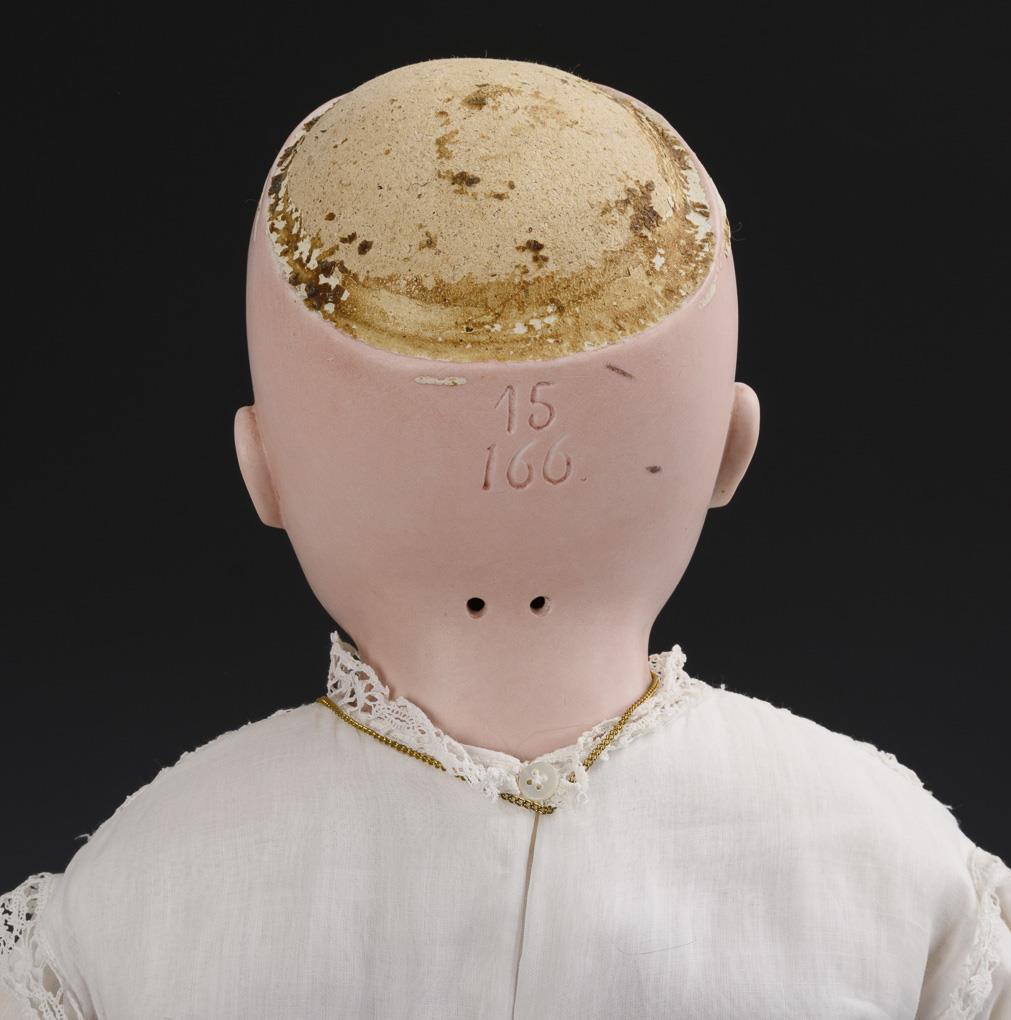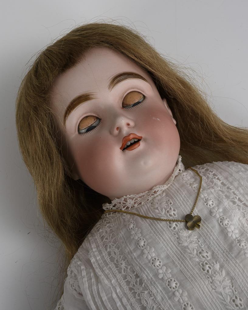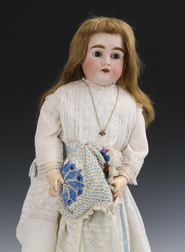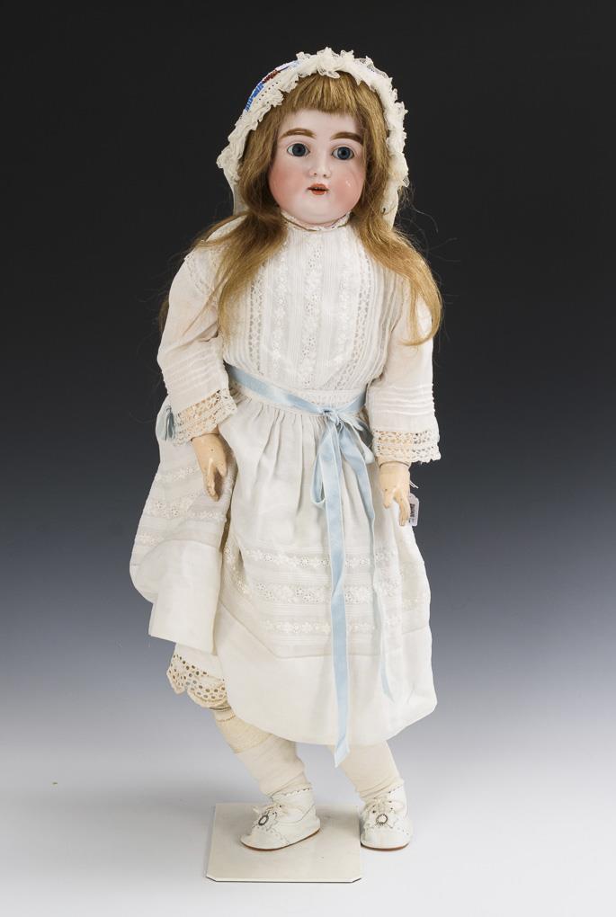 Blue sleeping eyes, sculpted eyebrows, firmly plastered head cover, blonde real hair wig. Leather body with knee gussets and articulated arms. White dress with blue bow, hood with pearl embroidery. Head not x-rayed: without defects, only cheek rubbed and small production-related uncleanliness on the breast plate. 1 knee with open seam.