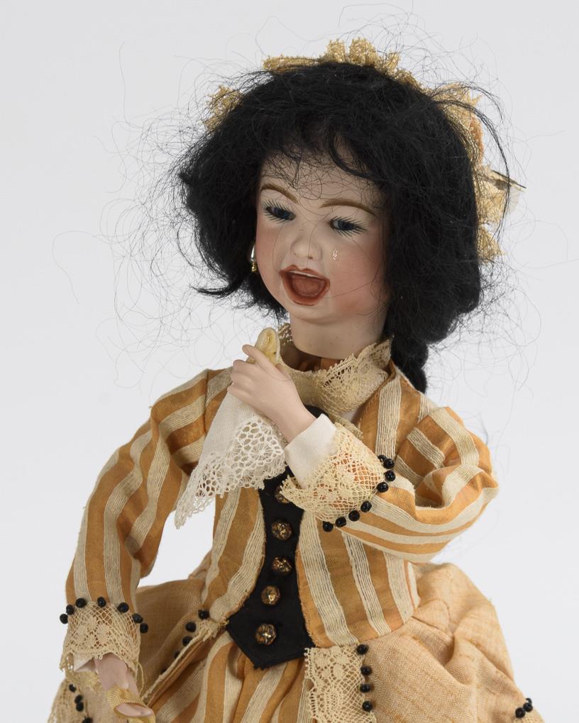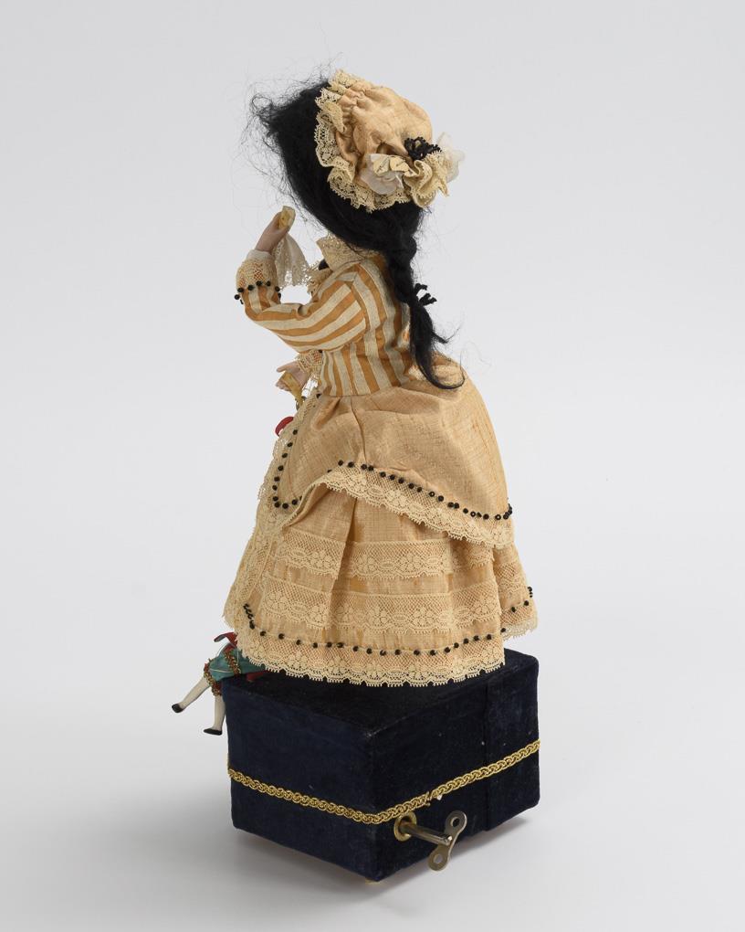 Girl with broken marionette, on velvet-covered base with music box. Work running, with fixed key.