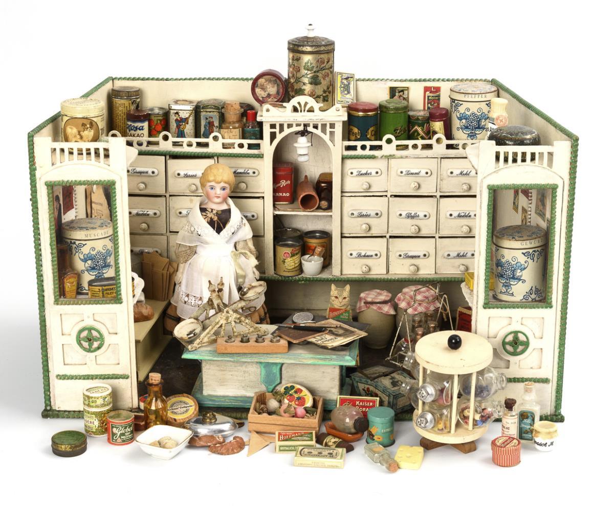 Trapezoidal 1-room cabinet, 2 glazed display windows, fixed store fitting, 18 drawers with inscribed porcelain labels. Numerous accessories, such as scales, tin cans, glass containers, cardboard boxes, etc. Including a bust doll as a saleswoman. Worn, signs of age, minor defects.