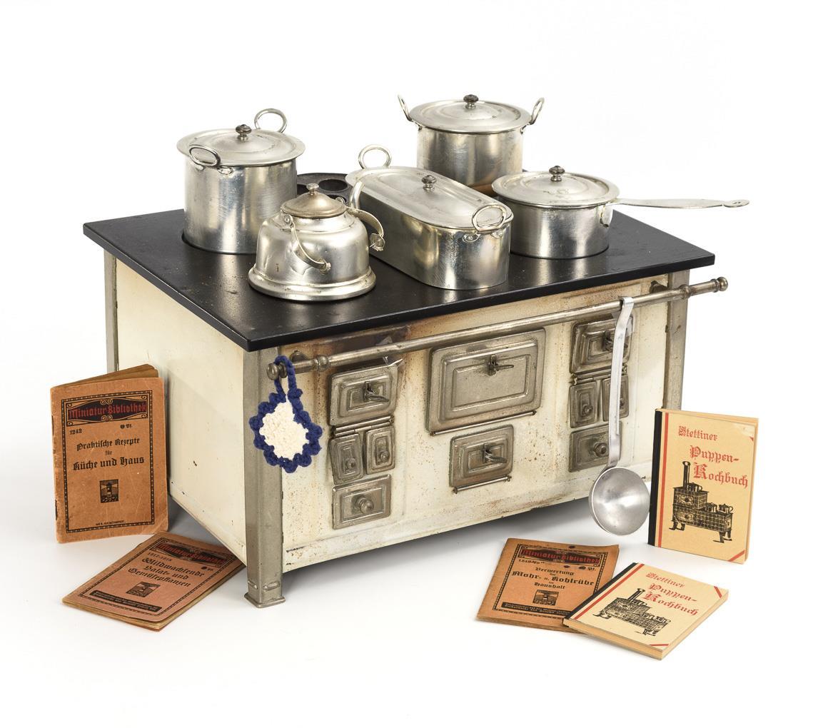 Tin stove with 5 burners, front railing, nickel-plated oven doors and original equipment: 2 pots, saucepan, roasting pan and kettle. Comes with 5 small booklets: 2x "Stettiner Puppen-Kochbuch", "Praktische Rezepte für Küche und Haus", "Verwertung der Mohr- und Kohlrübe im Haushalt", "Wildwachsende Salat- und Gemüsepflanzen". Worn, with signs of age and use.