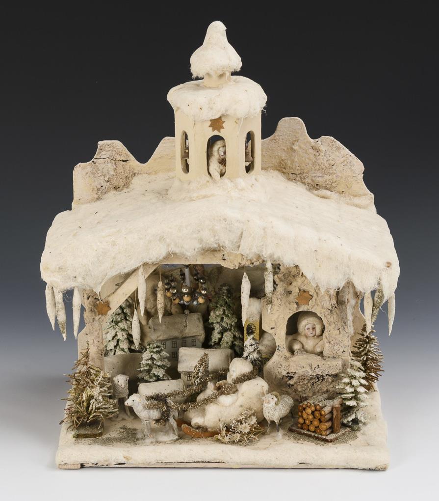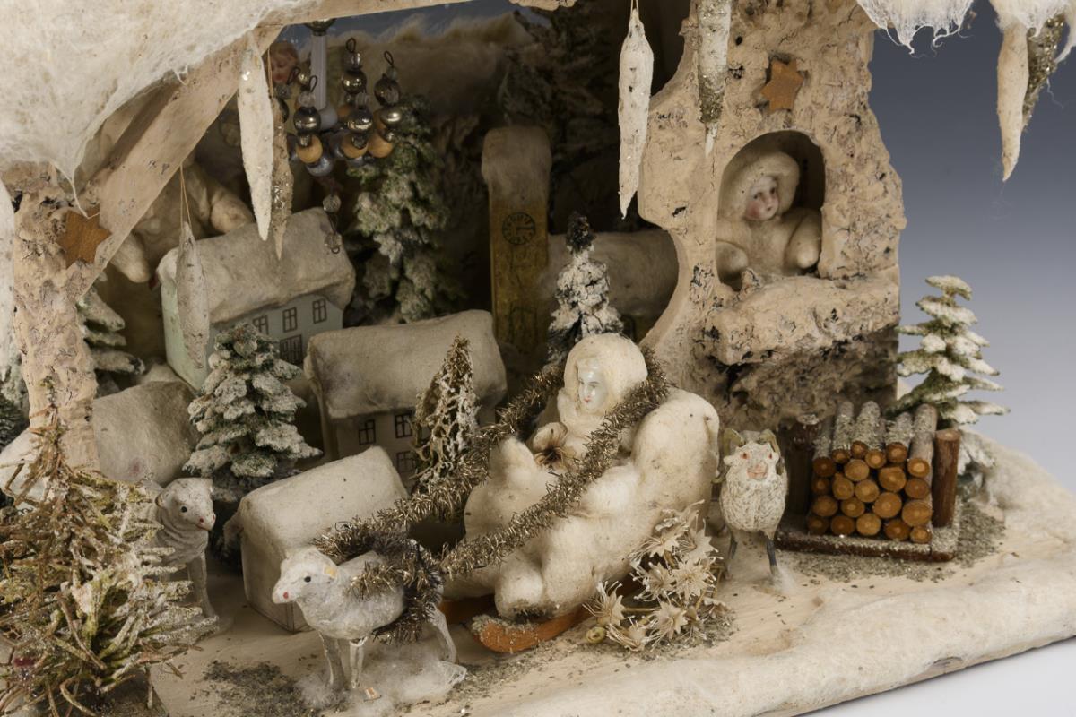 Landscape constructed in the manner of a doll's house with houses, a church and a snow-covered fir tree, with little dolls.