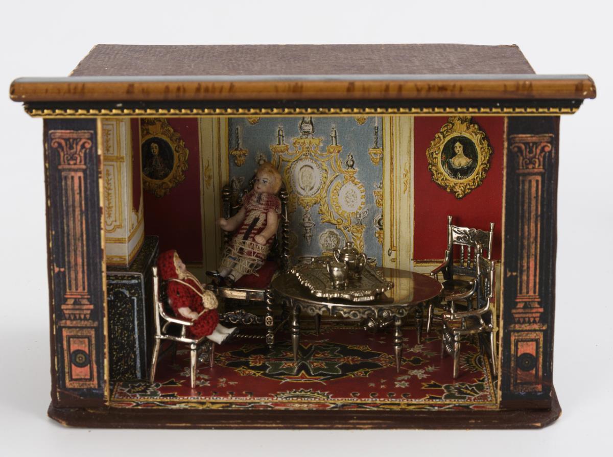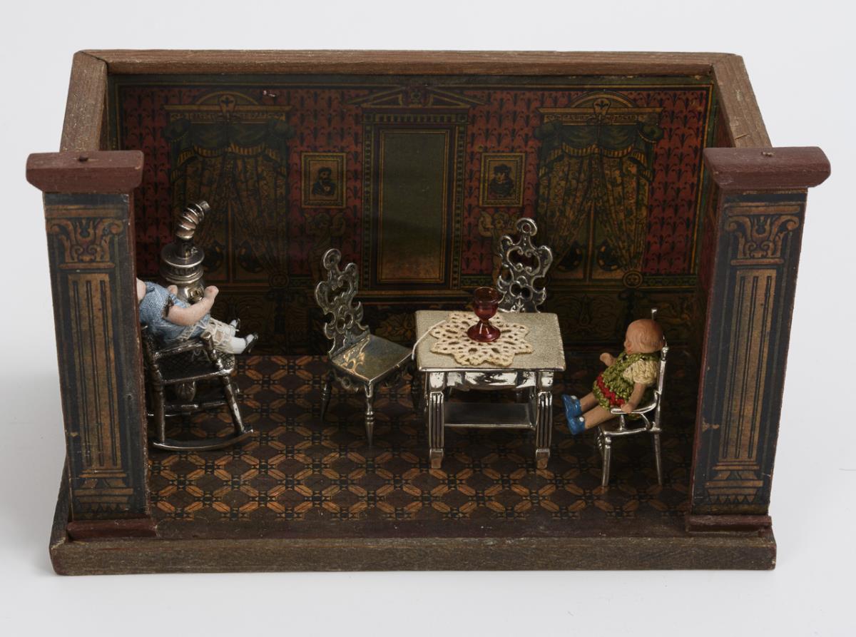 Small cases built from cigar boxes with colored wallpaper in the old style. 3x furnished with miniature silver furniture, 1x with pewter figures. Plus a total of 6 little dolls.
