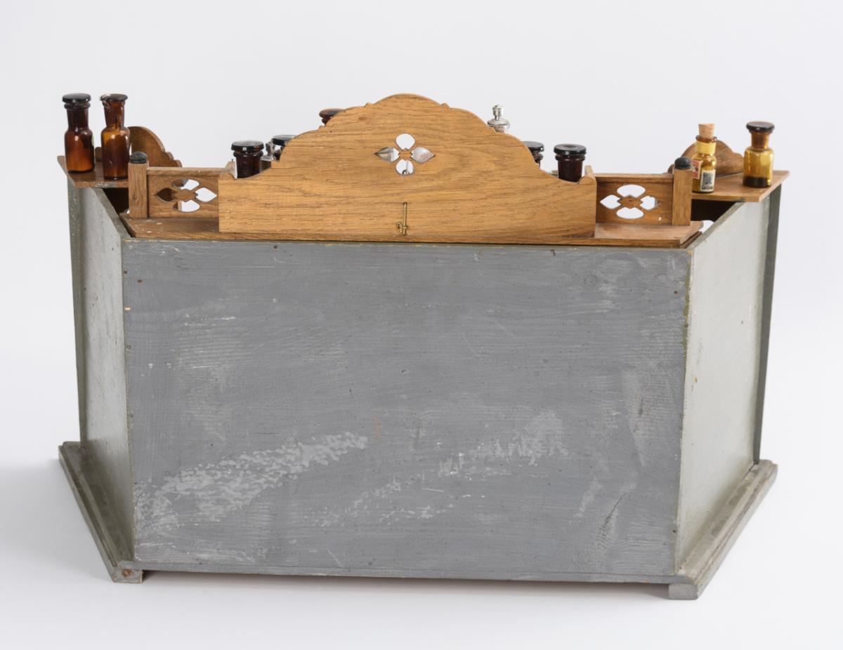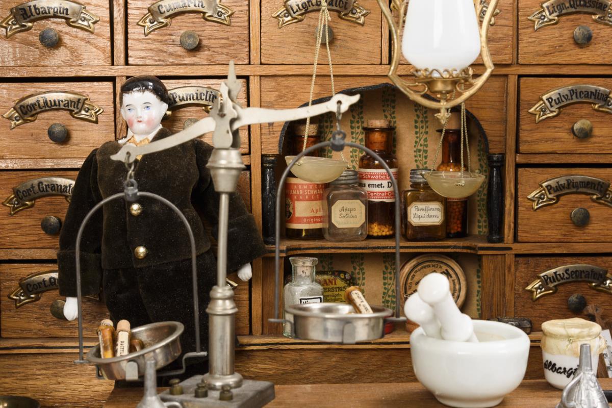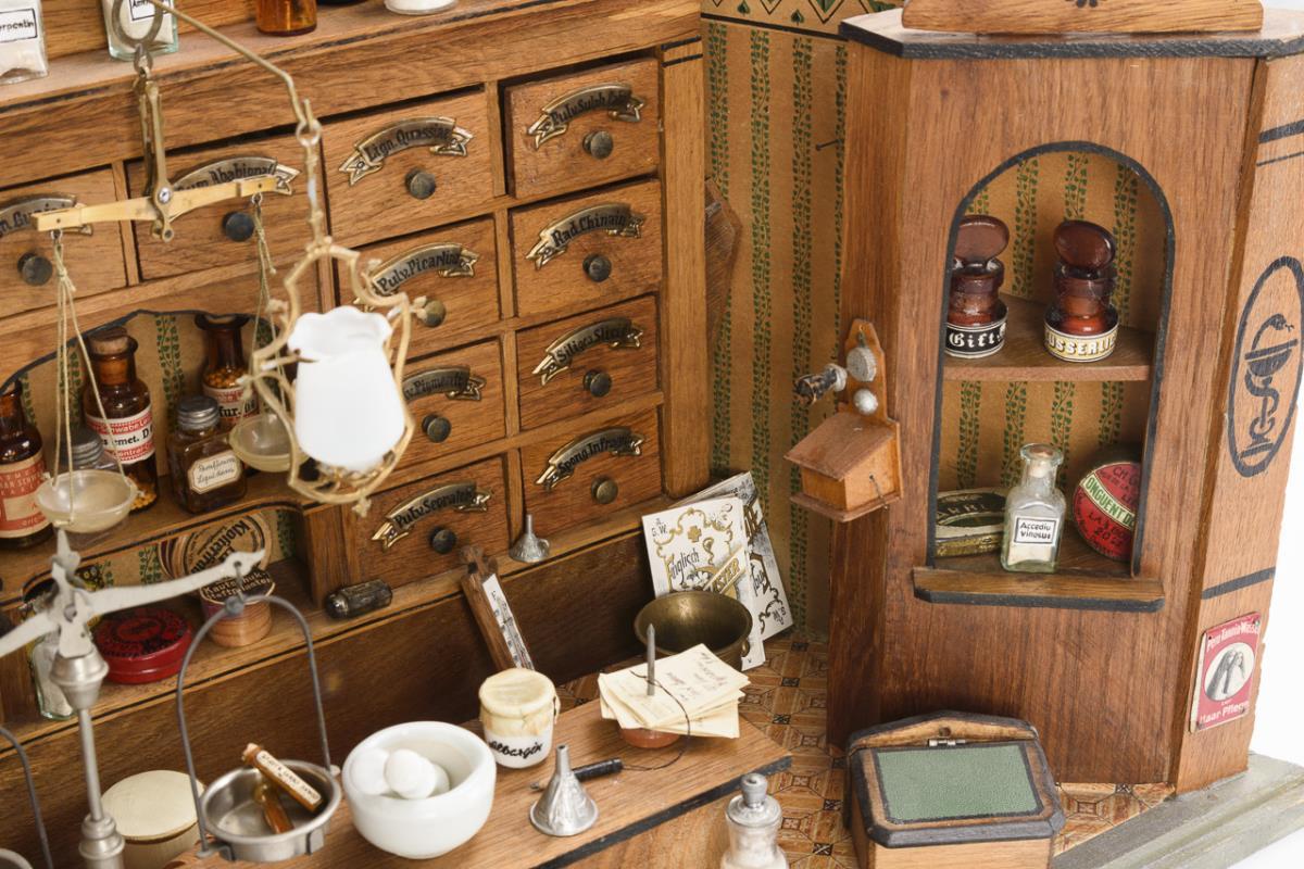 Trapezoidal case with old wallpaper and parquet-style floor paper: Decorative store with fixed oak store fittings, 18 labeled drawers, 2 display windows and loosely set counter. In addition, numerous accessories and salesperson with glazed chest head, fabric body, 20.5 cm. Eventually reworked, shop window unglazed.