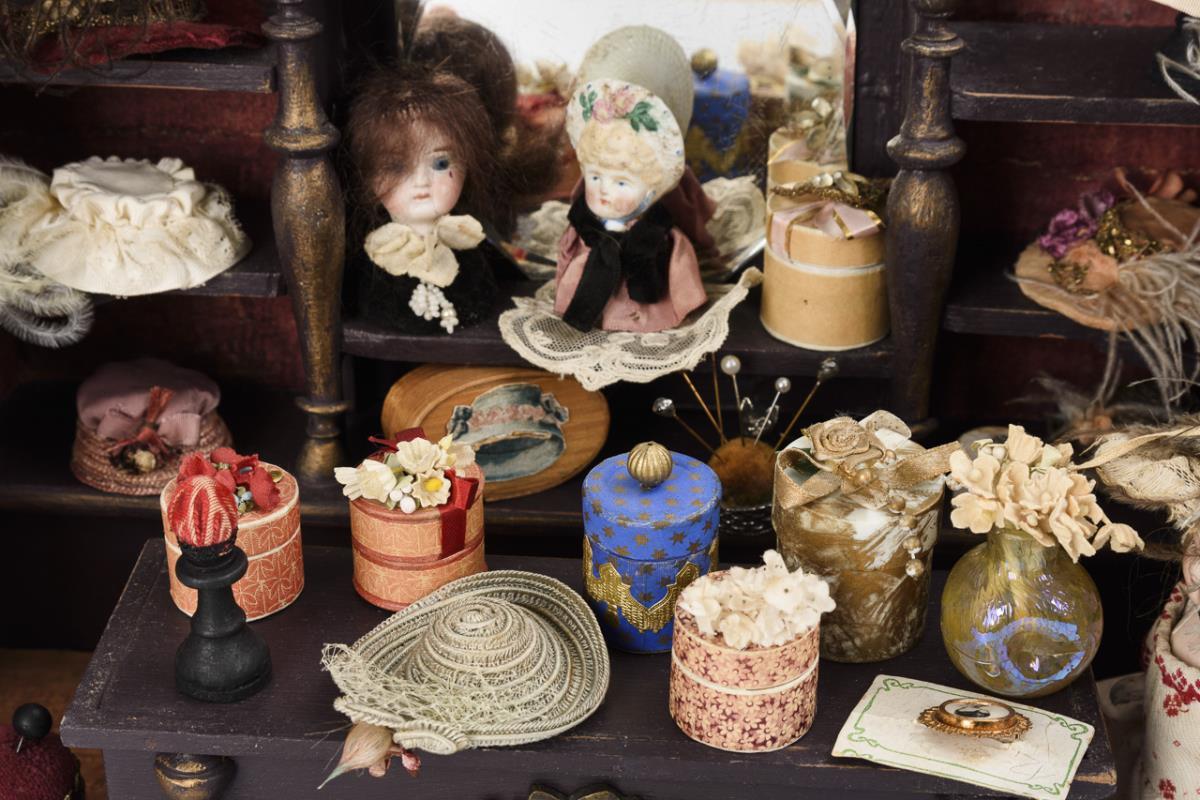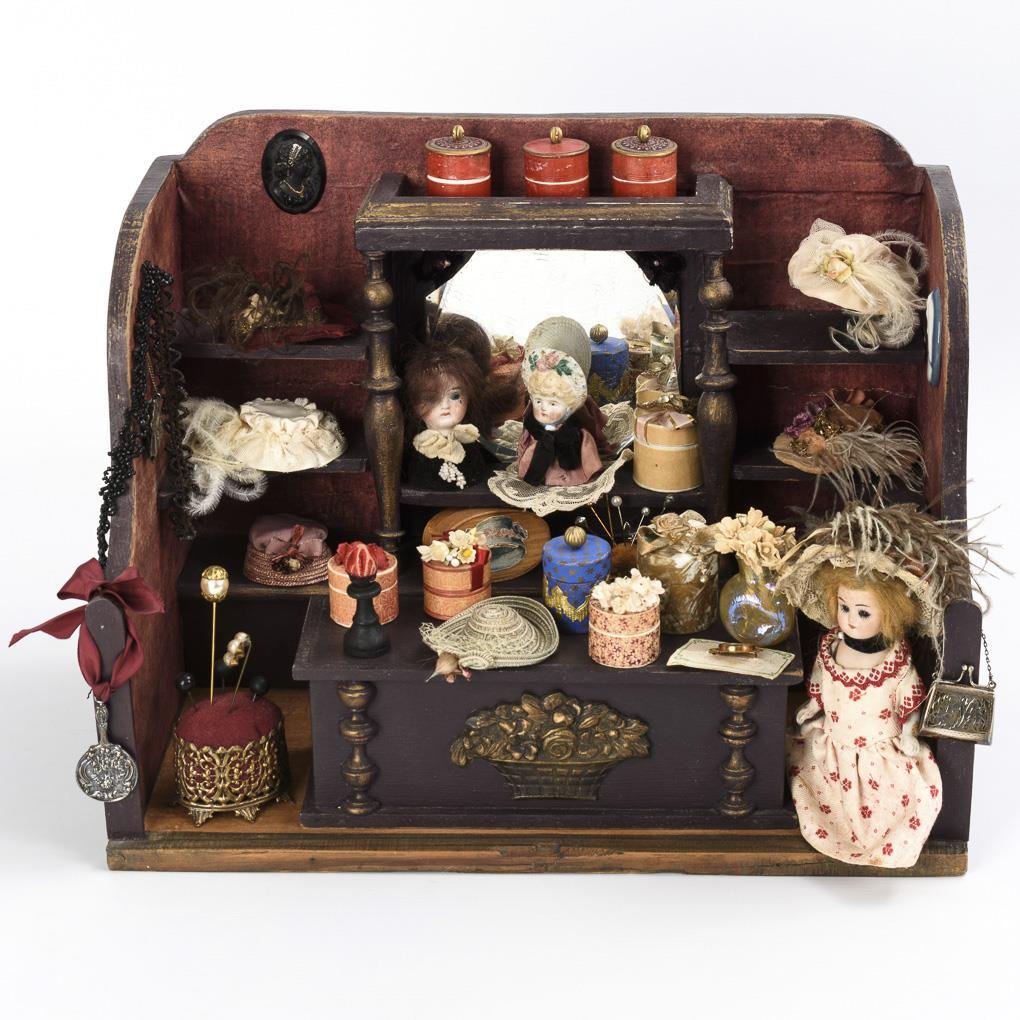 Small 1-room cabinet with dark brown store fittings, turned columns and mirror. Furnished with hats, boxes and hatpins, plus 1 little doll with feathered hat. Worn, minor defects.