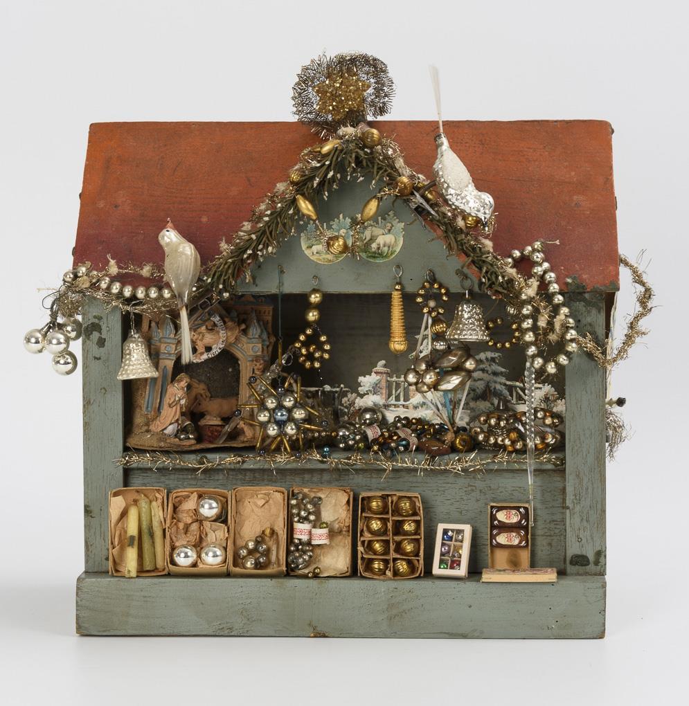 Christmas hut in the shape of a house with roof and chimney. Fitted with glass Christmas tree decorations, including old Gablonz ornaments. Signs of age, small defects.