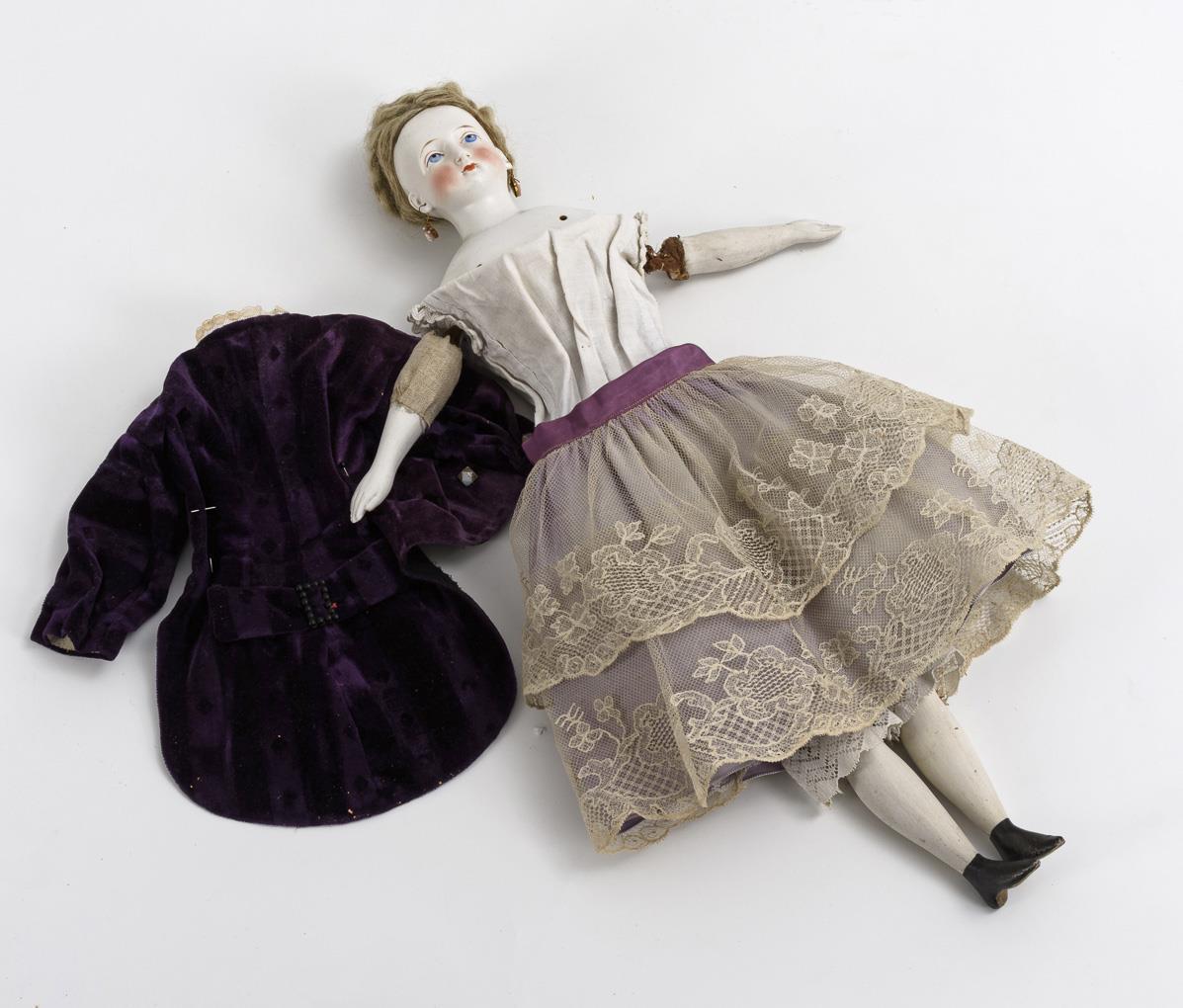 Pale parian head, painted blue eyes, earrings, blond mohair wig with braided hairstyle. Fabric body with bisque limbs and sculpted black shoes. Light tulle skirt, velvet jacket. Body with defects (trickles!), 2 limbs almost loose.