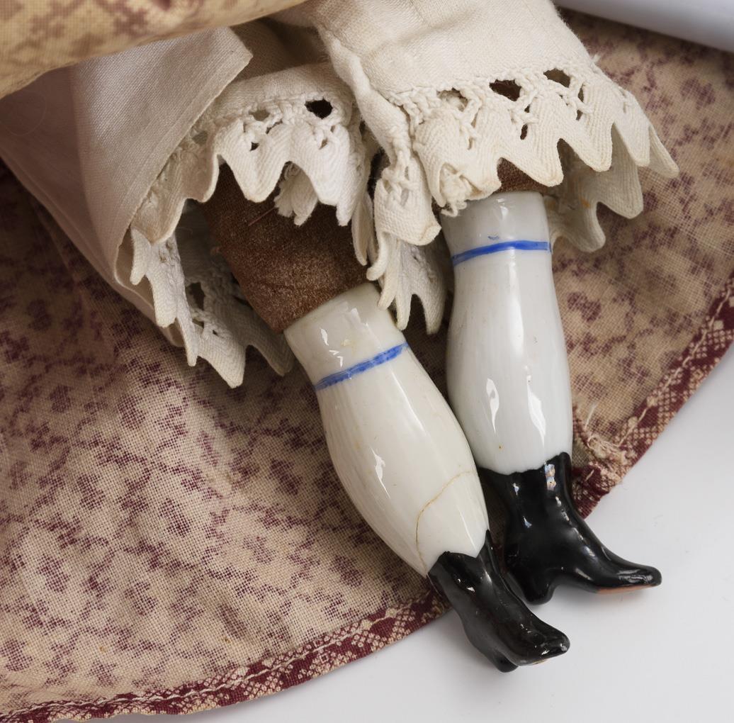Both with painted blue eyes, sculpted hair and fabric body. The taller one with black hair, earrings, leather arms, pink dress and black barge hat. Breastplate with hairline crack at the back, l 44 cm. The smaller one with blond hair, porcelain limbs and sculpted boots. Body trickling, 1 foot glued, l 29 cm.