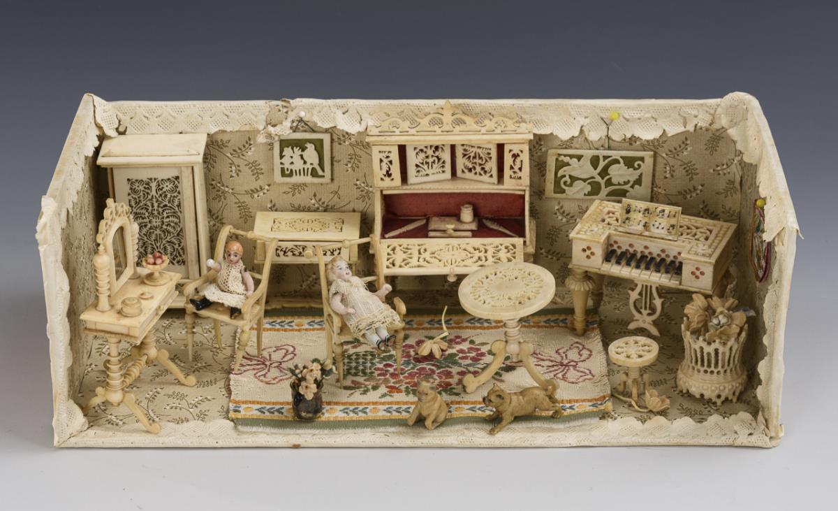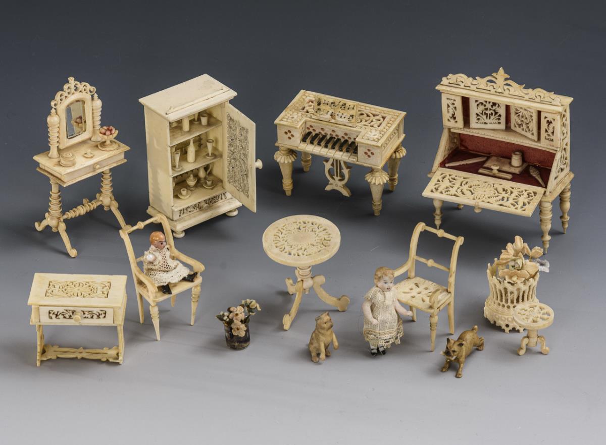Decorative, finely carved furniture: writing desk, spinet, cabinet, small table, chair etc.. With 2 little dolls and 2 small bisque pug figures. In a case made from an old cigar box (as an encore). Small defects and glued areas.