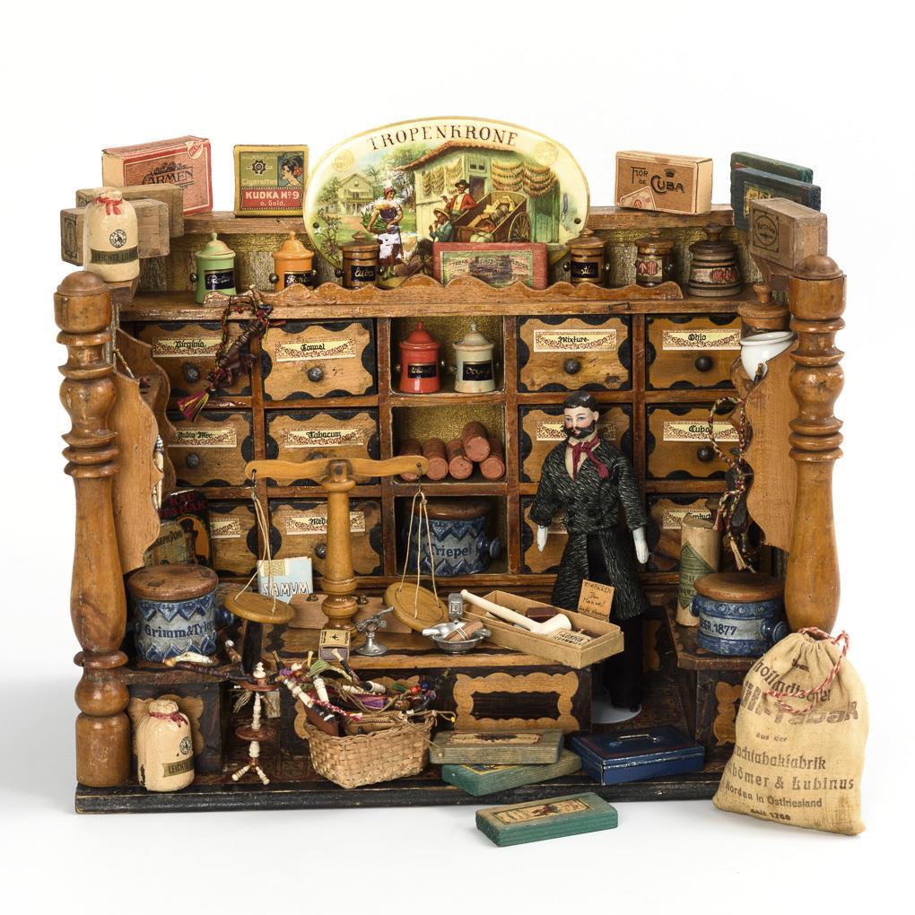 Tobacco store / colonial goods store furnished with attention to detail: Fixed store fitting with 12 hand-labeled drawers, 3 blue wooden tobacco pots in ceramic look (2x Grimm & Triepel, 1x Hen-schu), miniature pipes, pipe stand, cigars, loose tobacco etc. Including doll's house salesman with full beard (L 15 cm). Minimal signs of age.