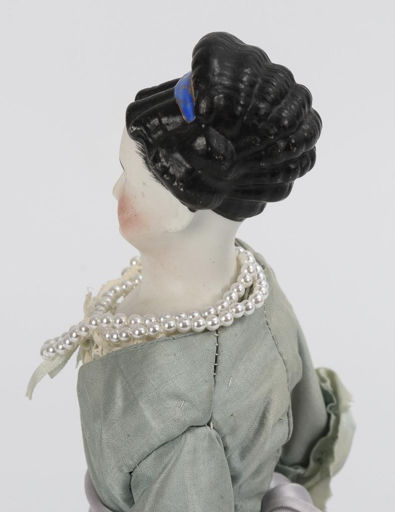 Light bisque head with modeled black hair, fabric body and slender porcelain limbs. Light green silk dress, pearl necklace, modeled shoes.