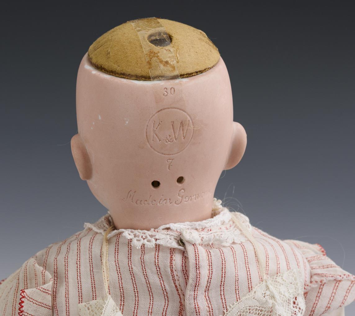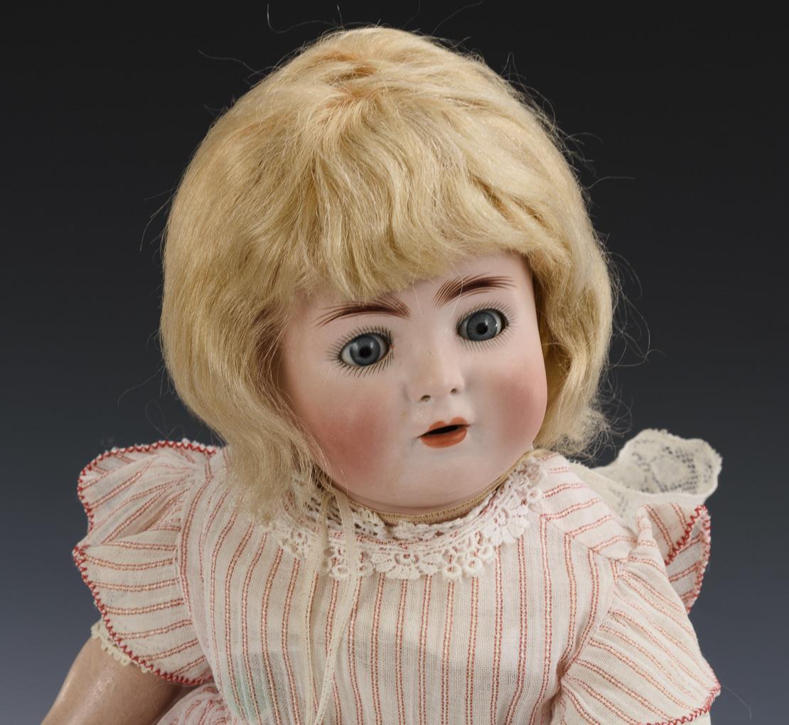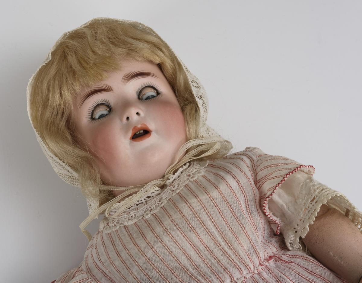 Cranked head, blue sleeping eyes with rubbed lids, blonde mohair wig. 15-part toddler body. White pinafore dress with red pinstripes, white leather boots, white bonnet. Head x-rayed: without defects, only some wig pull at the crown of the head and the back of the head. Right hand and left thigh repaired.