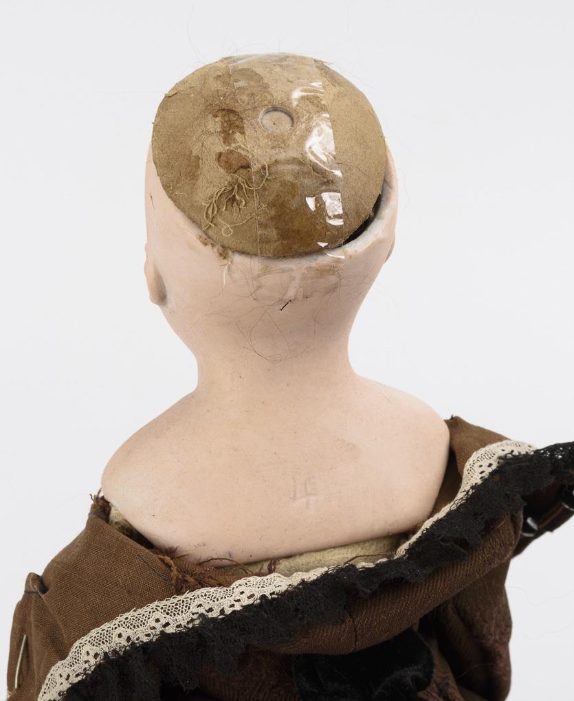 Fixed blue glass eyes, open mouth, pierced ears, brown mohair wig. Leather body with gussets on elbows, buttocks and knees, bisque forearms. Brown costume, white fur stole, hat with feather ornament, l 39 cm. With 2 dogs with white real fur, h 13/14 cm. Head x-rayed: without defects. Dogs with broken legs.