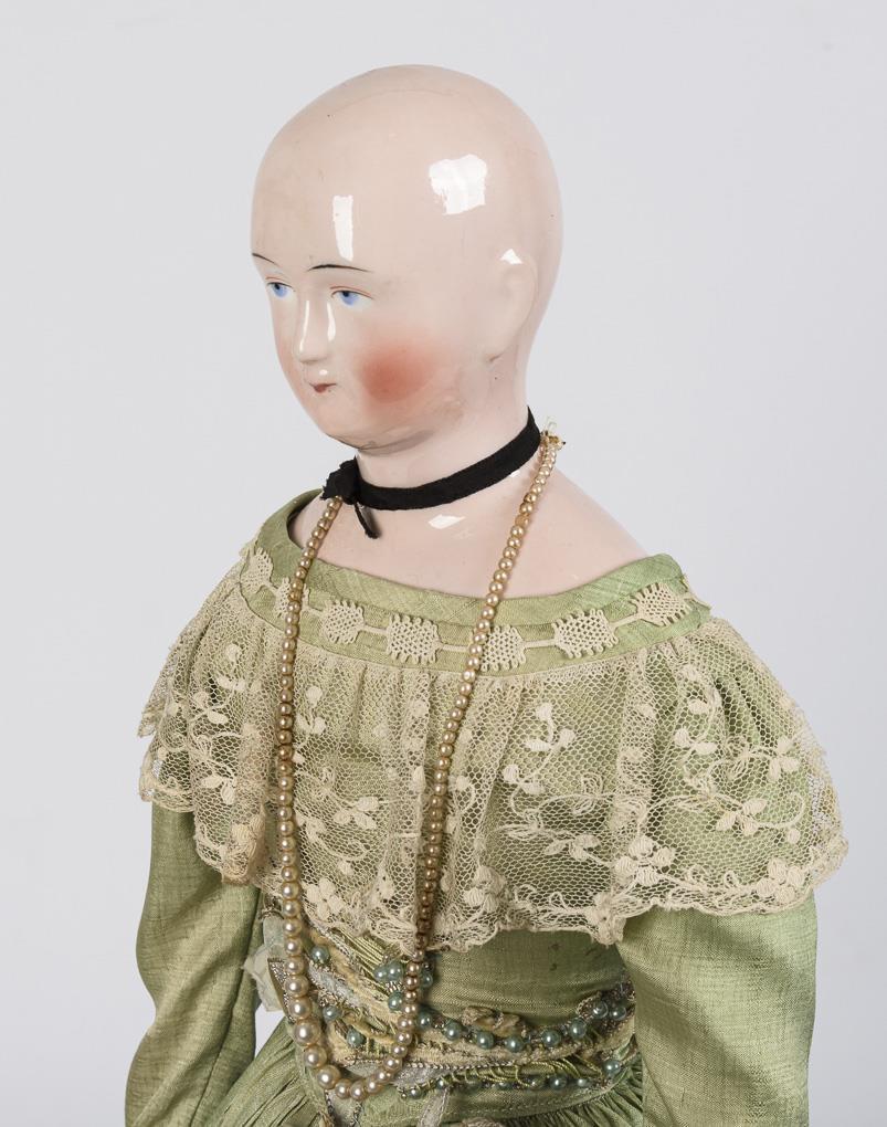 Rare chest head doll with green dress. Possibly Schlaggenwald.