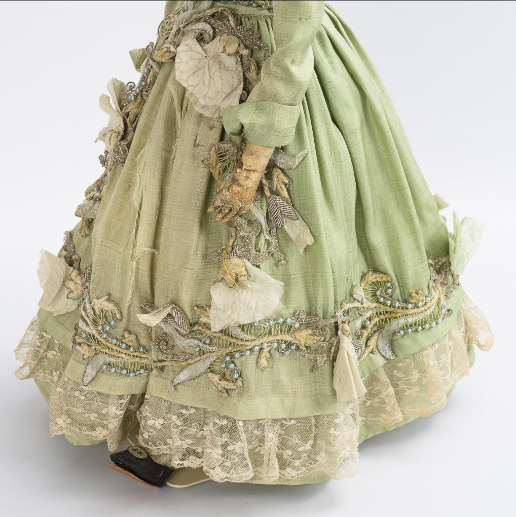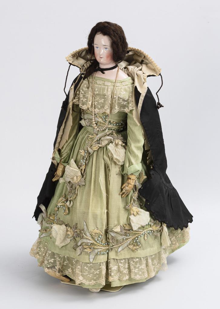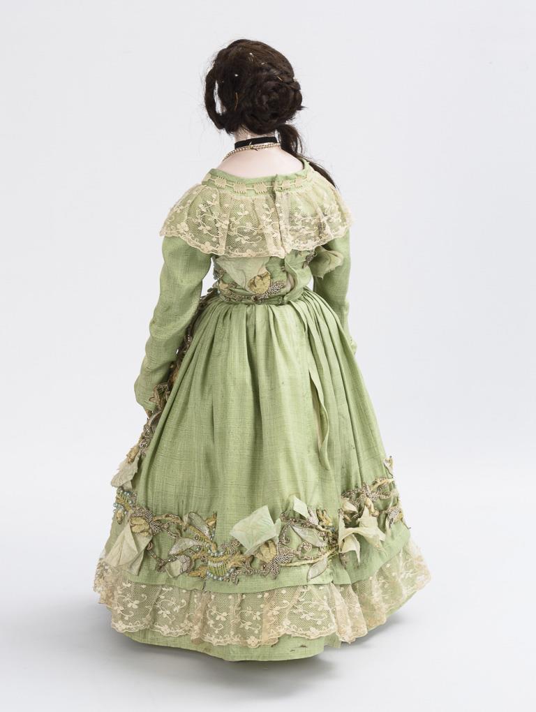 Glazed head with large black dot on the back of the head ("Bald Head"), painted blue eyes and brown real hair wig. Leather body with flailing limbs and individually stitched fingers. Dress of wild silk with wide skirt, black cape, black shoes. Head without visible defects, hands with repairs.