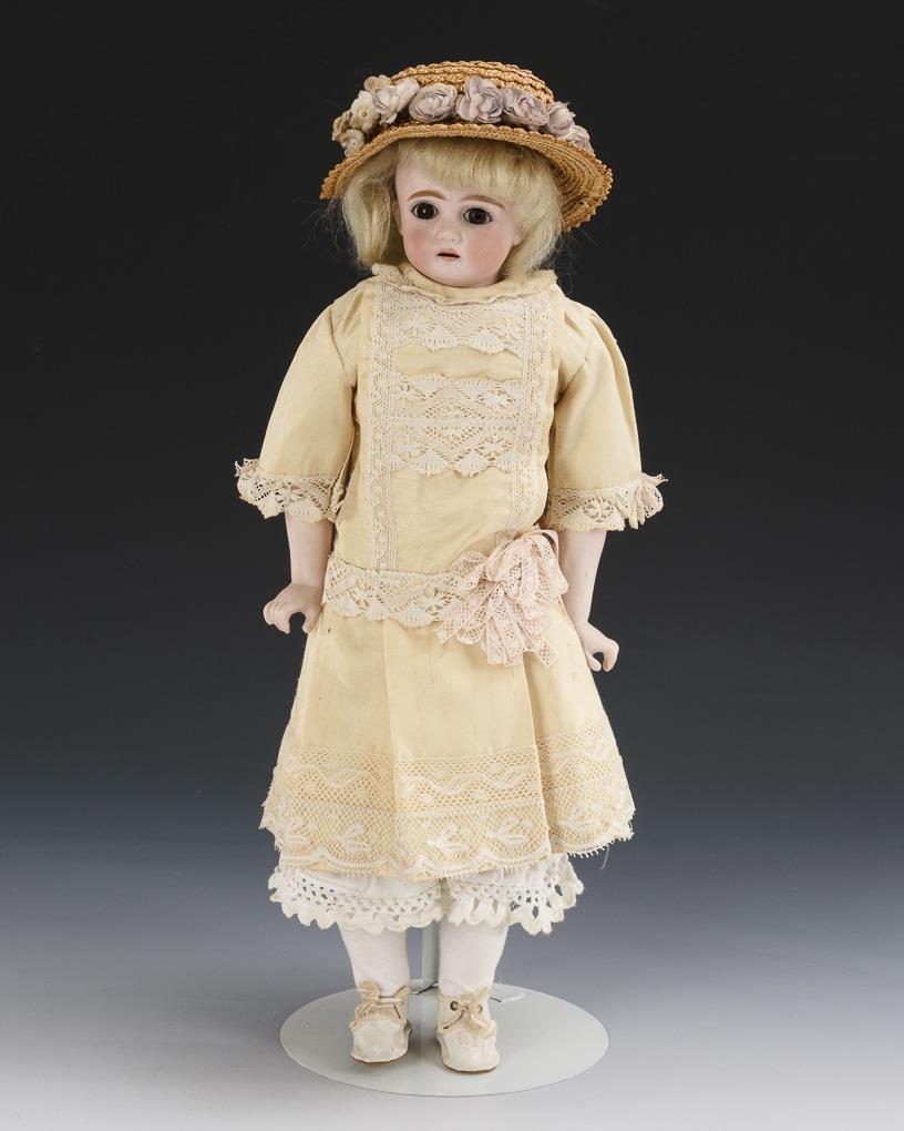 Brown sleeping eyes, blond mohair wig, fabric body with bisque limbs, cream-colored silk dress, straw hat, white shoes. Head x-rayed: without defects, right leg with glued defect.