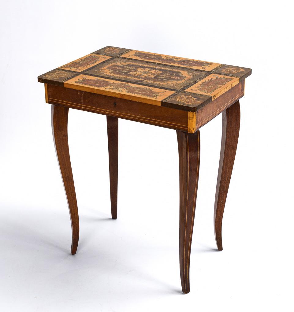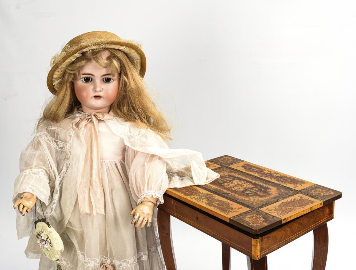 Cranked head, brown sleeping eyes, earrings, long blond human hair wig. 17-piece articulated body. Long white tulle dress with pink bows, brown leather children's shoes, straw hat. Comes with an elegant little table with inlaid, hinged top, some sewing accessories inside. 43 x 37 x 27 cm. Head x-rayed: without defects. Body partially rubbed, toes bumped, 1 finger missing on the right, 1 finger glued. Table with slight signs of age.