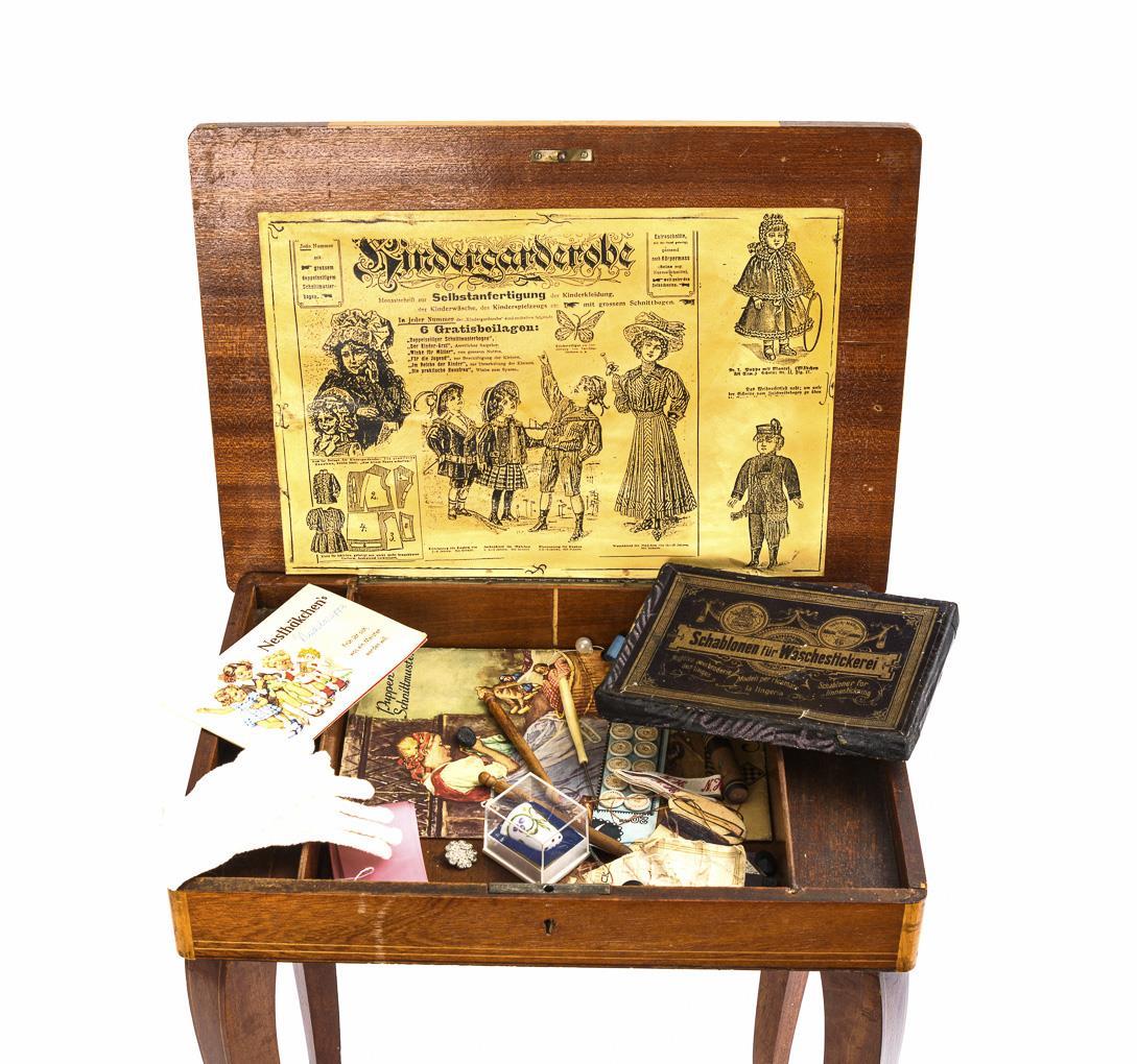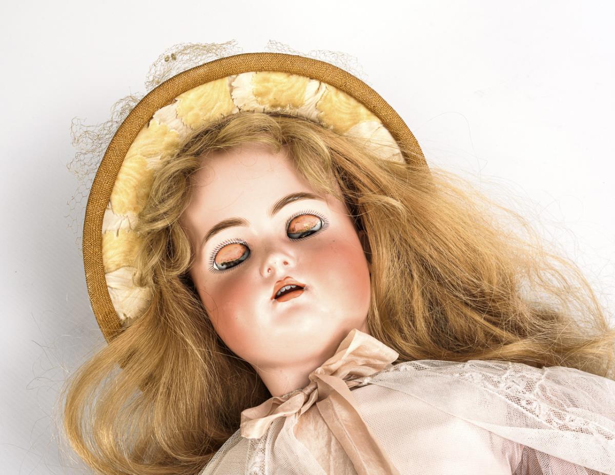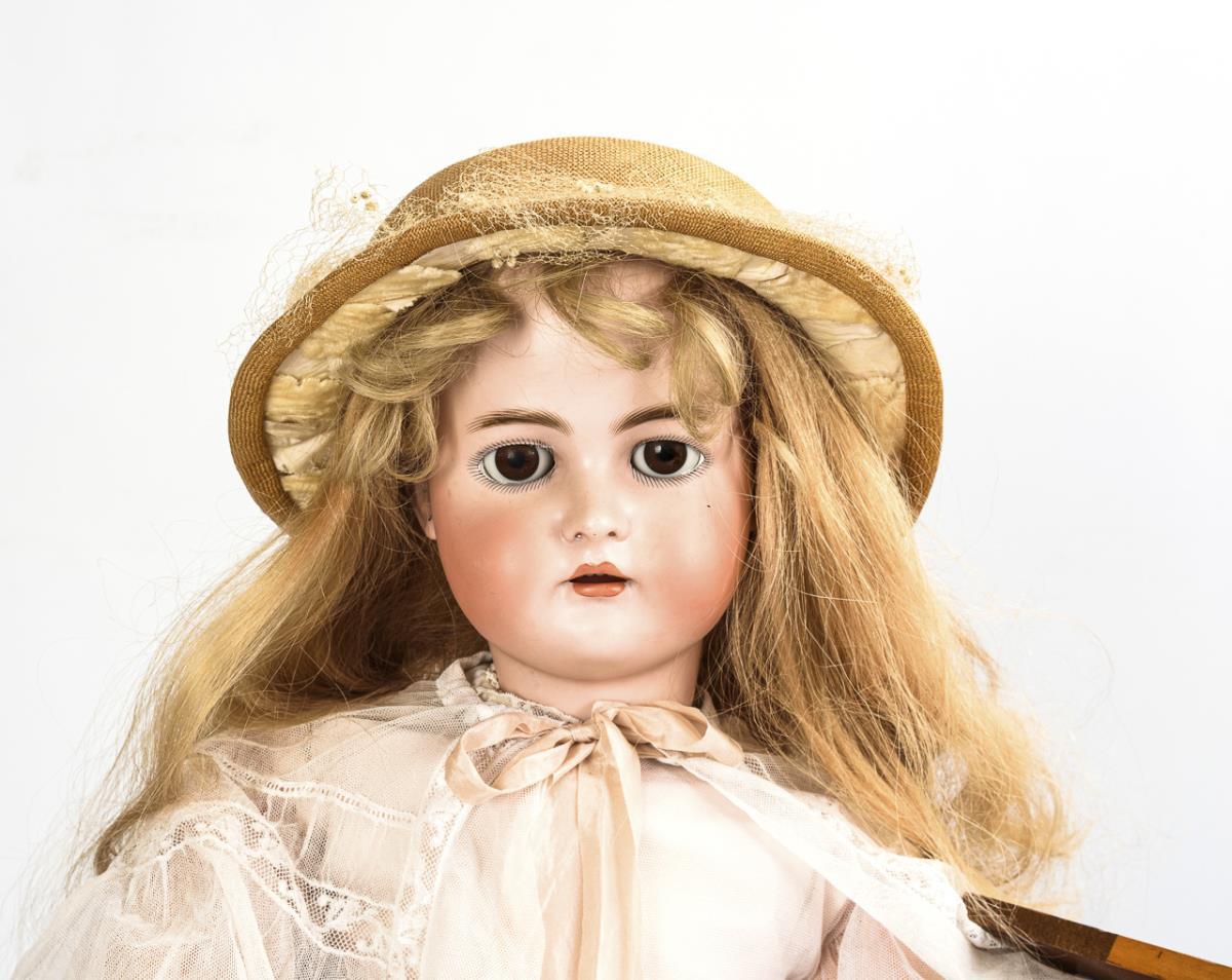Large porcelain head doll and children's sewing table. Kämmer & Reinhardt.