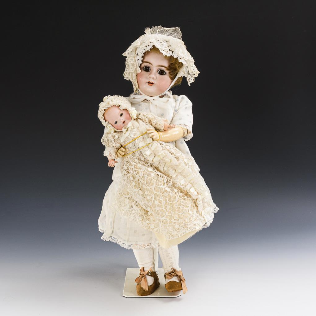 2 porcelain head dolls as mother and child. Heinrich Handwerck and Armand Marseille.