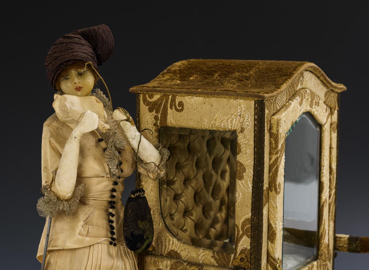 Elegant lady with waxed bust and cream-colored silk costume. On a plinth with Spanish label. L 31 cm. / 3-sided glazed sedan chair with brocade-like fabric covering. 1 carrying bar broken off (loosely attached). 28.5 x 15.5 x 11.5 (or 26 cm). / With 3 white dogs and 1 teddy bear with white real fur. Parts with signs of age.