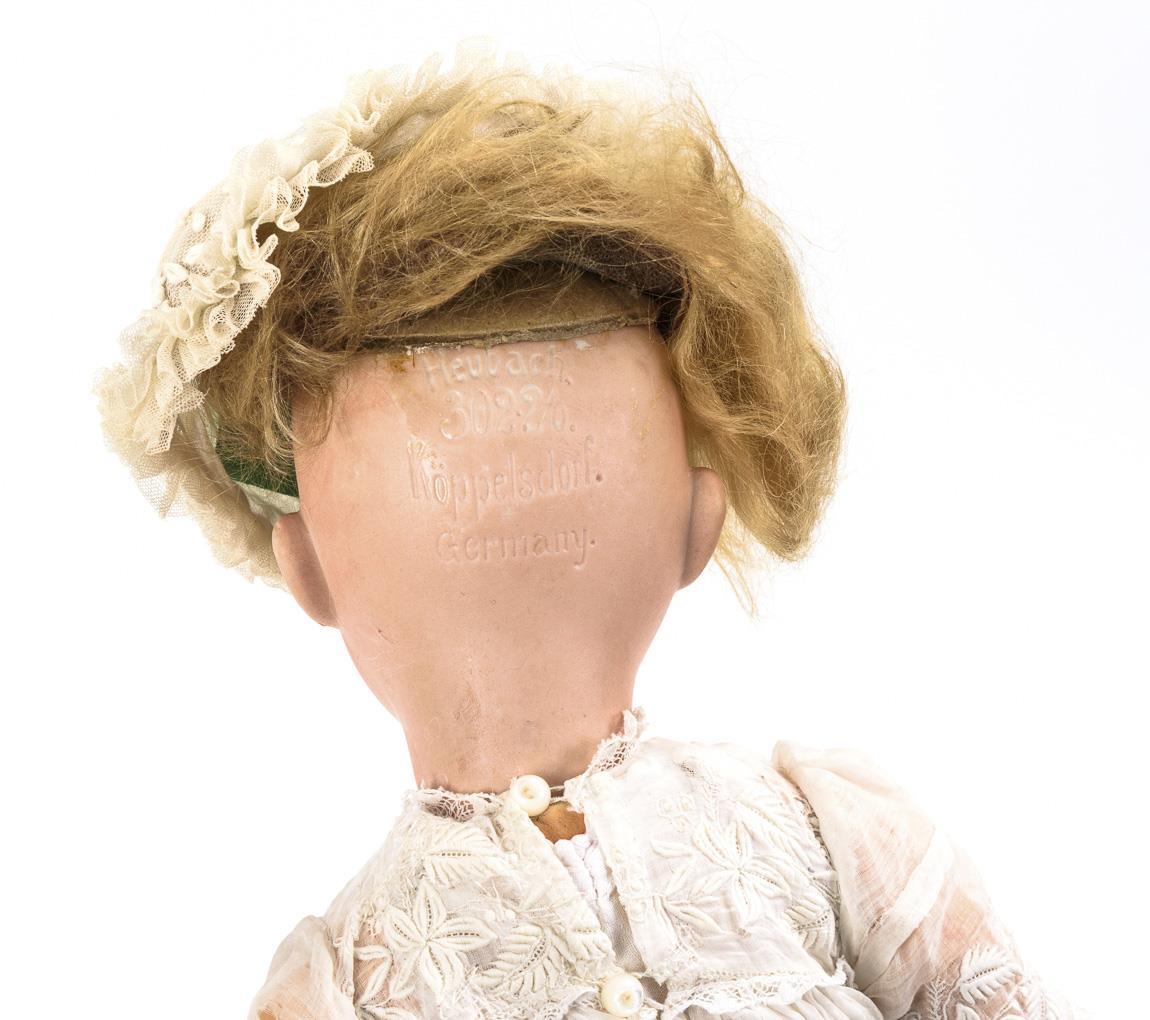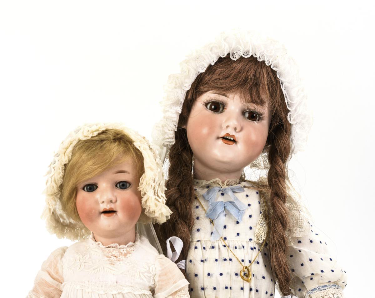 Doll girl (AM 390n) with crank head, brown glass eyes, eyelashes, light brown real hair wig with plaits, 15-piece jointed body and white dress with blue dots. Small chips to the neck crank, left foot with temporary repair, l 63 cm. / Blond character baby (Heubach Köppelsdorf 302) with crank head, blue sleeping eyes, mohair wig, 5-part sitting baby body with voice. White dress, hood and black patent leather shoes. Head without defects, body with overpainting, l 39 cm.