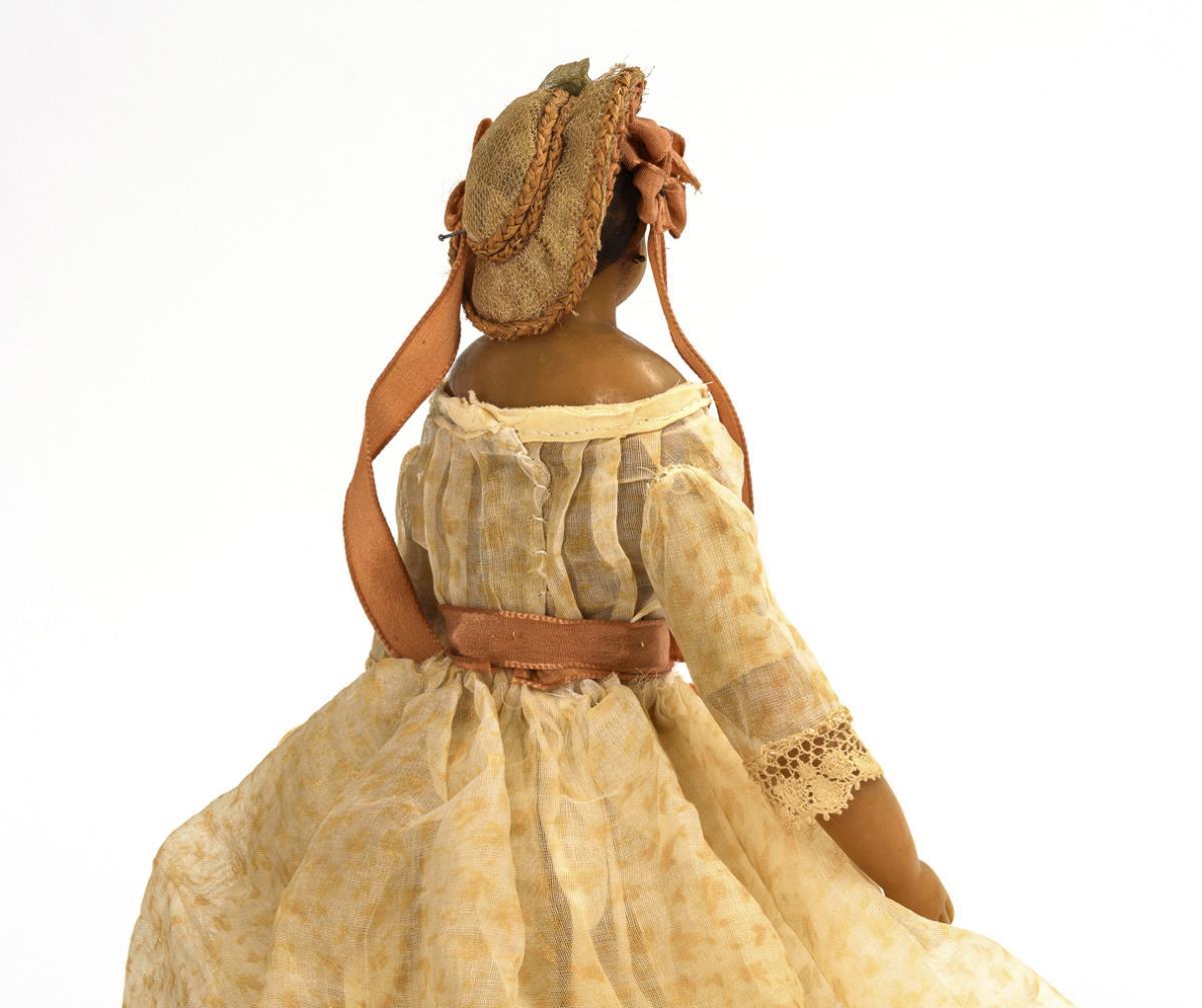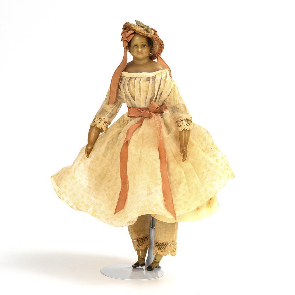 Both with wax head, fabric body and wax forearms. The larger one with blue glass eyes, blond mohair hair and dotted skirt, 1 shoe missing, l 35 cm. The smaller one from around 1840, with painted eyes and hair, wax lower legs and light-colored original clothing with hat and head bow. L 29 cm. Small chip to the back, 1 finger missing, legs repaired.