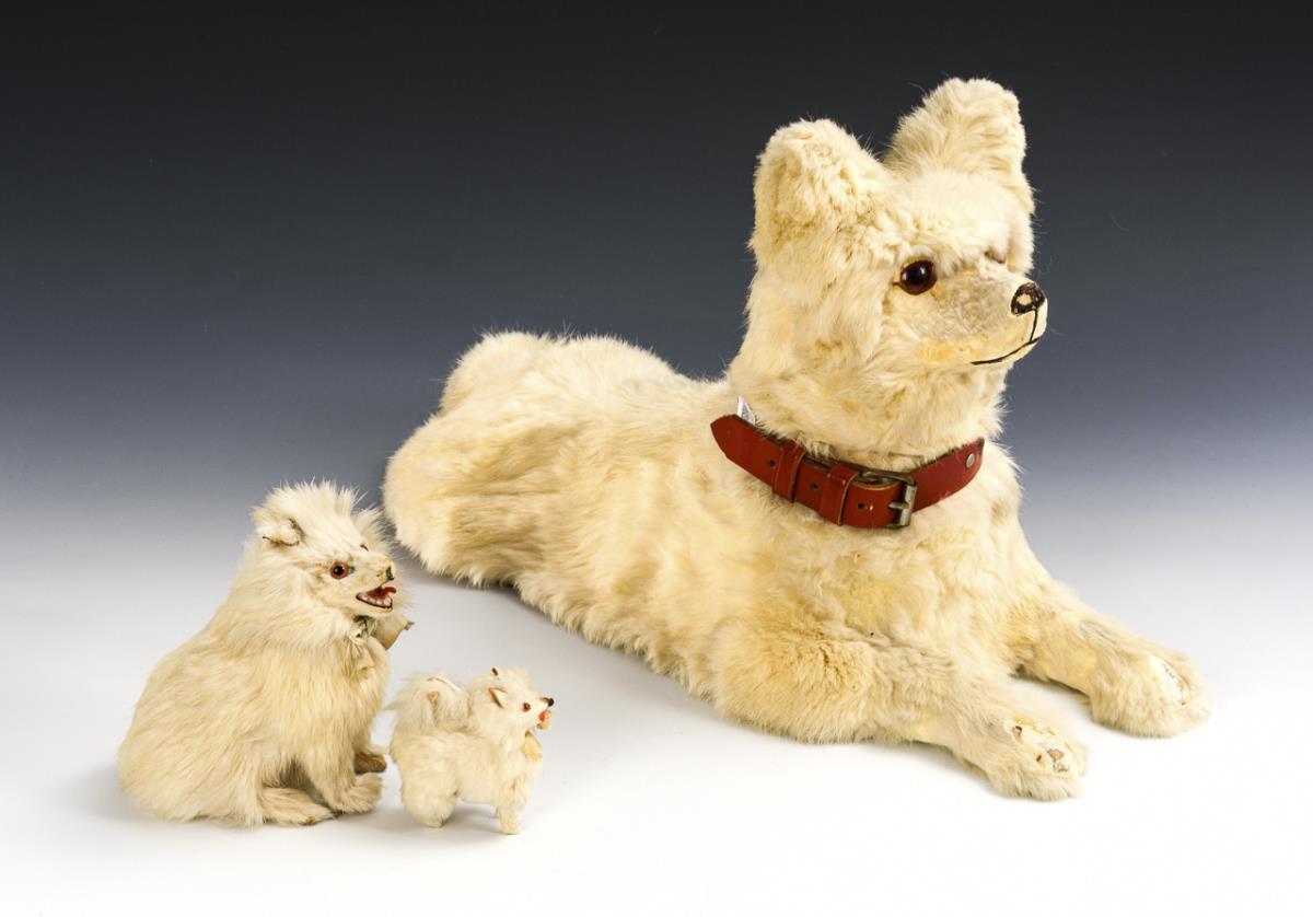Reclining dog with removable head and zipper on the underside, for storing nightwear. 27 x 46 cm. 3 Spitz dogs in different sizes (H 7, 14, 19 cm). Sitting cat with green glass eyes (H 22 cm). Parts with loss of fur.