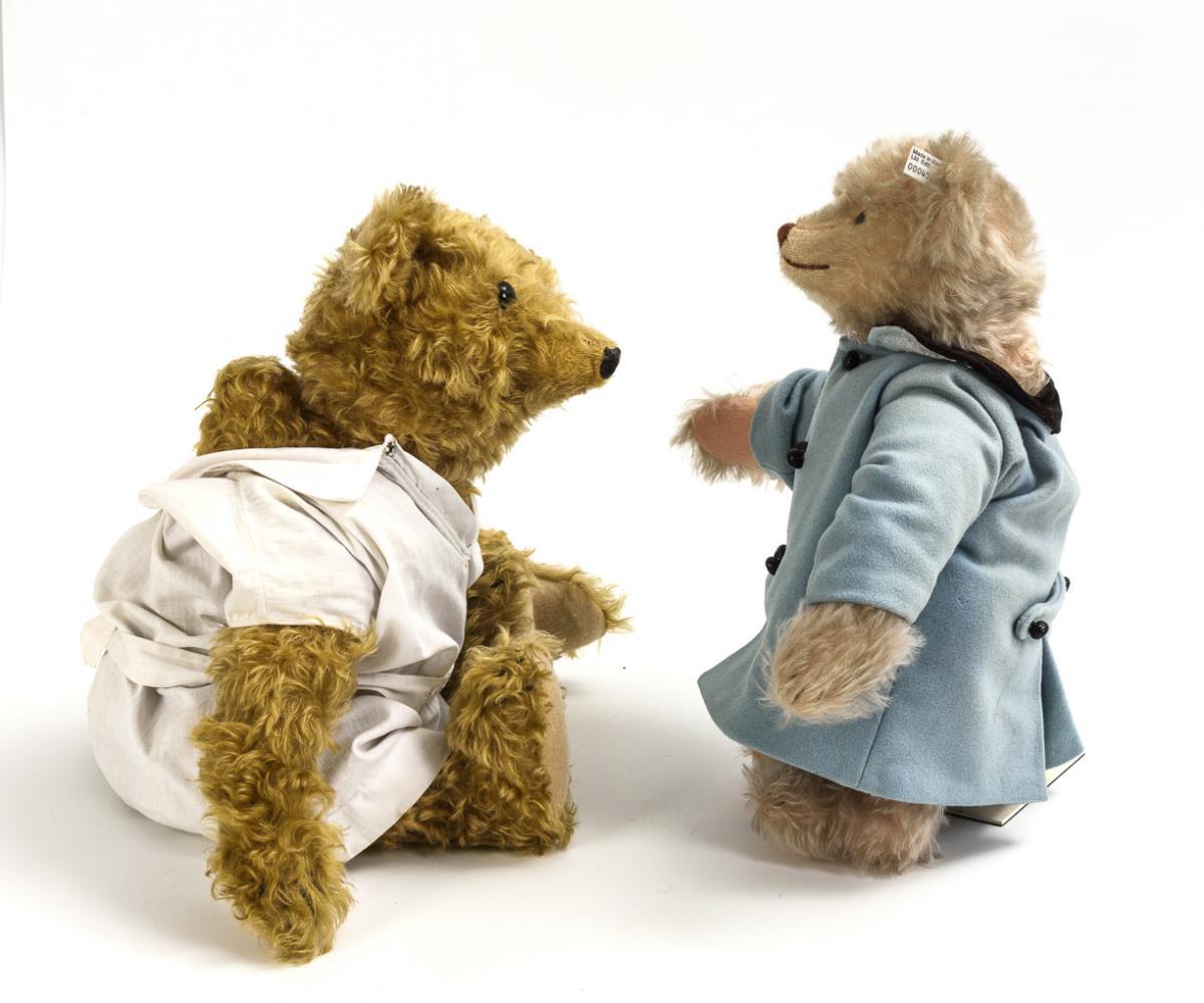 2 unused replica bears with long fur and clothing. 1x "Teddy Rose Replica 1925" (limited edition of 10000 pieces) with blue coat, 1x "Bärle" with bow tie and white shirt.