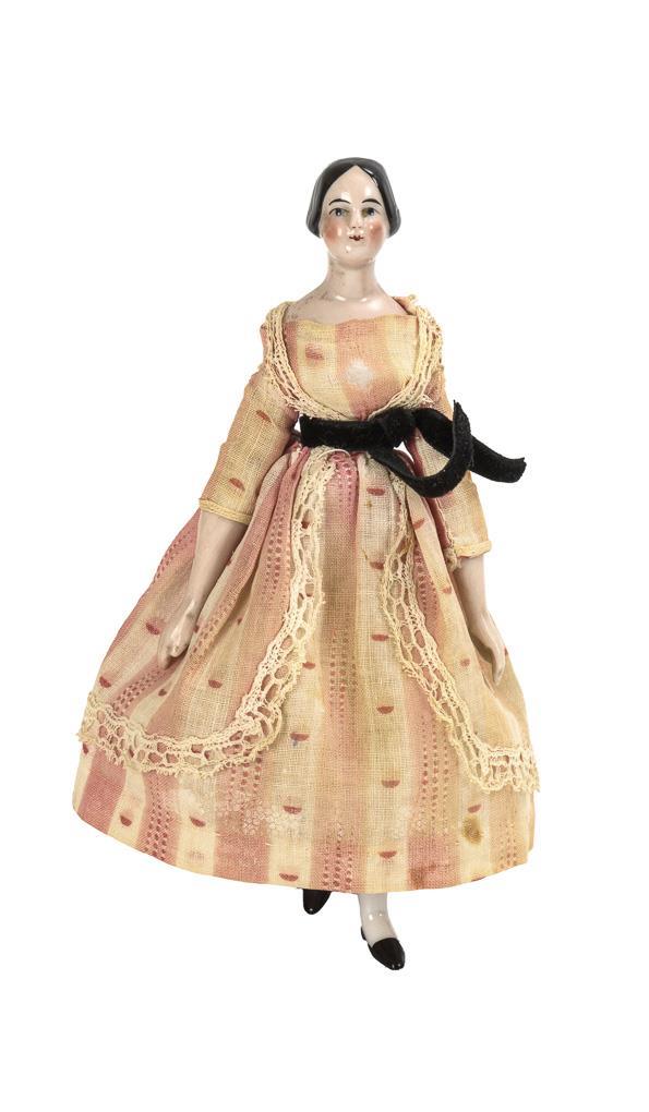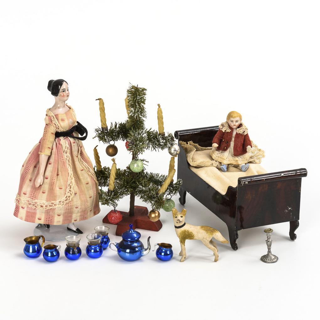 Rare Thuringian doll (around 1845/50) with wooden body. Arms, lower legs and chest head made of glazed and painted porcelain (L 15 cm). Wood-effect painted tin bed, circa 1860 (7.5 x 7 x 14.5 cm). Small whole bisque doll (L 6.5 cm), decorated Christmas tree (H 14.5 cm), mass dog, pewter candlestick and blue glass tea service. Signs of age, bed with lacquer defects and possibly reworked feet.