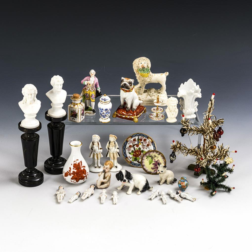 2 steles with white busts of Schiller and Goethe, 3 dog figurines and 1 kitten, various figures and miniature bathing dolls, 4 vases, 2 decorated Christmas trees etc. Traces of age, minor defects.