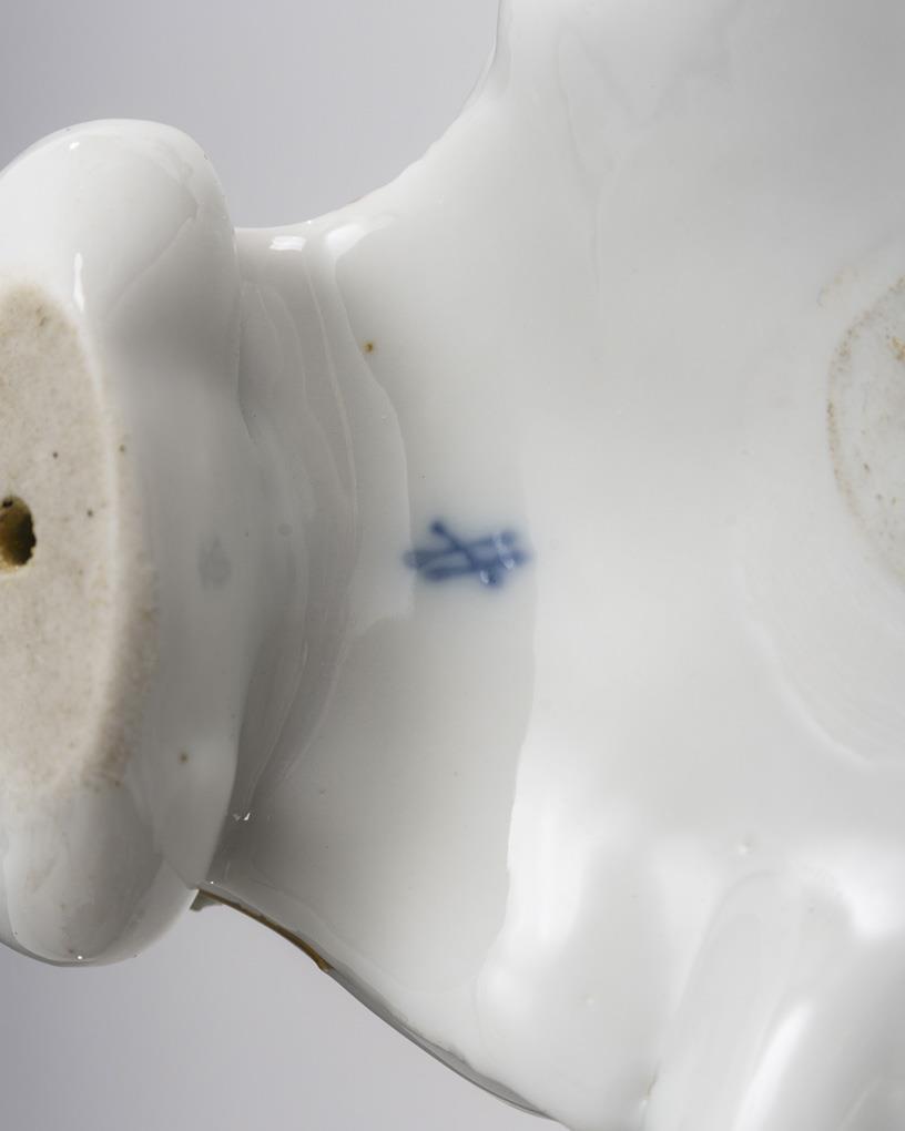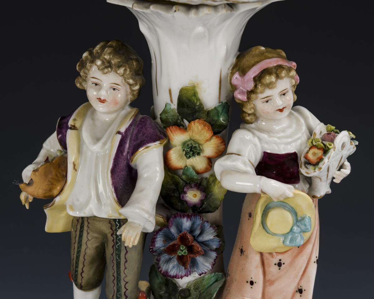 Breakthrough bowl decorated with rose garlands and forget-me-not wreaths, on a stem shaft with a pair of gardener children standing on the shaft, rocaille base with three feet and floral decoration. Bowl, partially restored floral decoration and 2 hands.