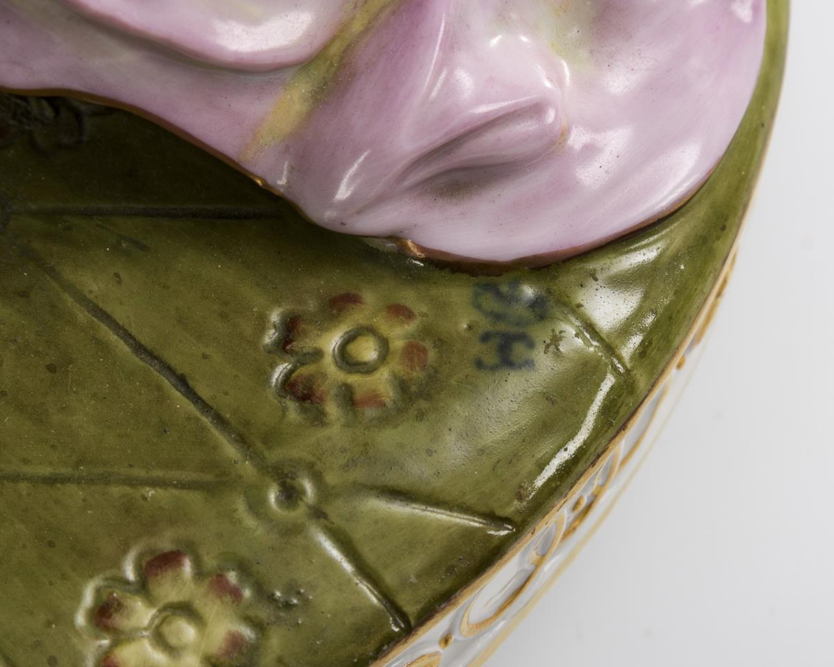 Three-figure group of a young lady at a spinet, a young lady dancing and a young gentleman. Restoration to the spinet and the gentleman's glove, floral decoration minimally restored.