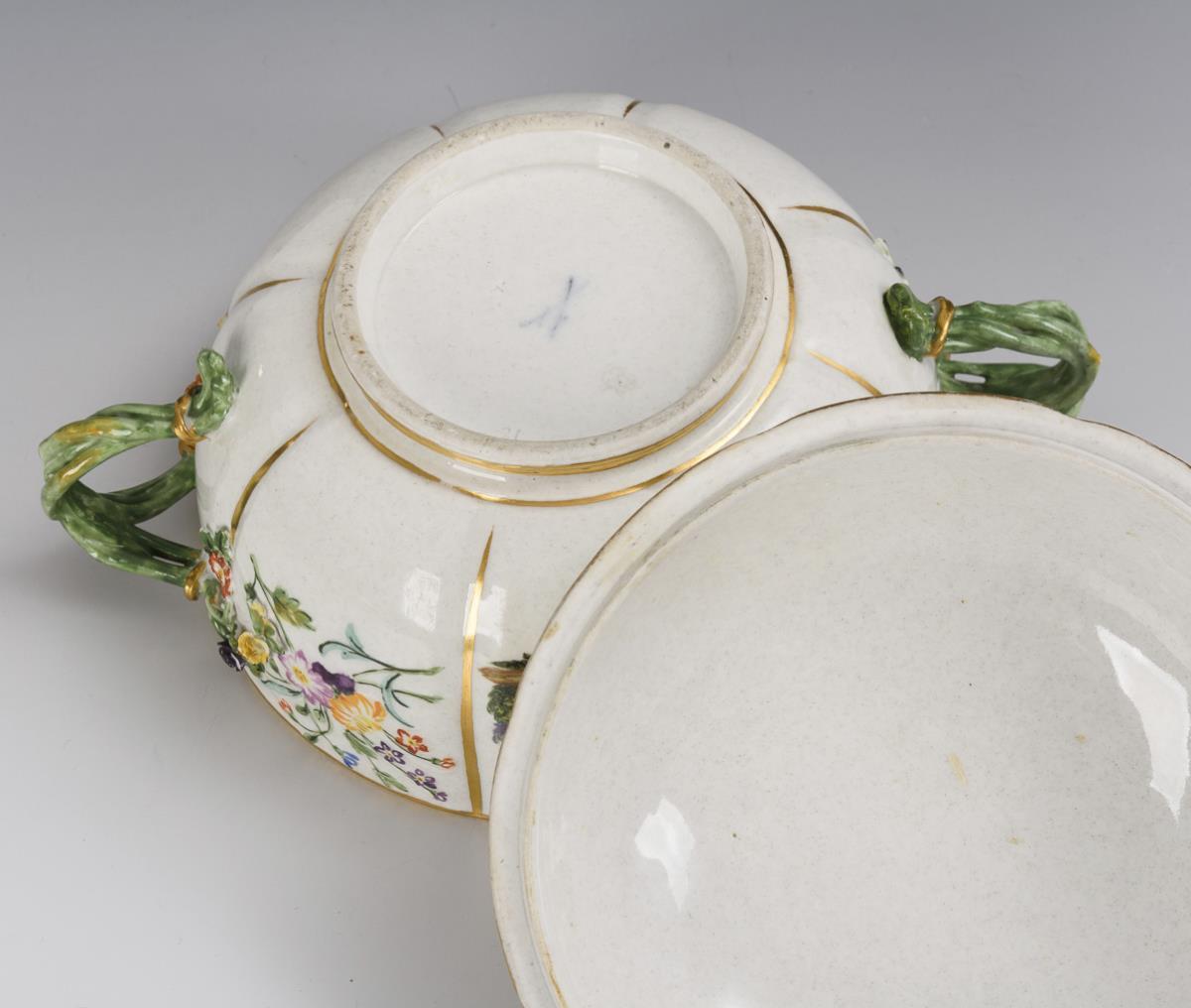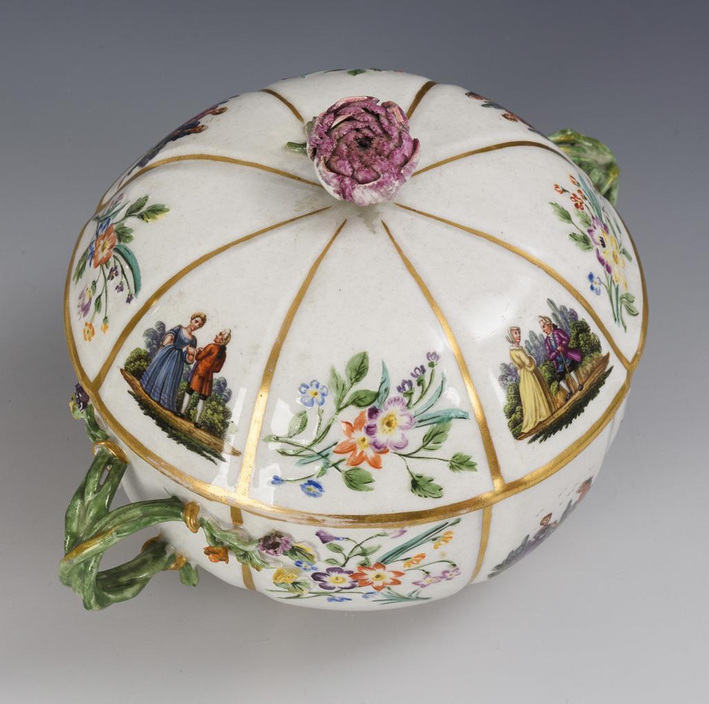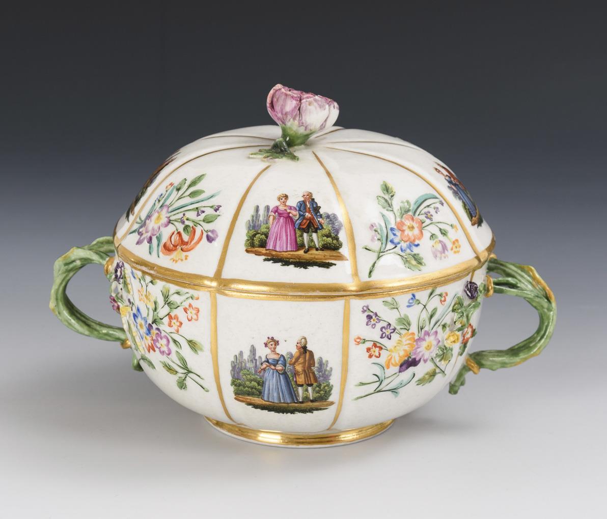 Eight-pass tureen with two branch handles and floral finial lid. Both sides depicting a gallant couple in a landscape, floral decoration on the handle branches and floral relief. Knob bumped, flowers partially bumped, 1x handle base restored, gold partly rubbed.