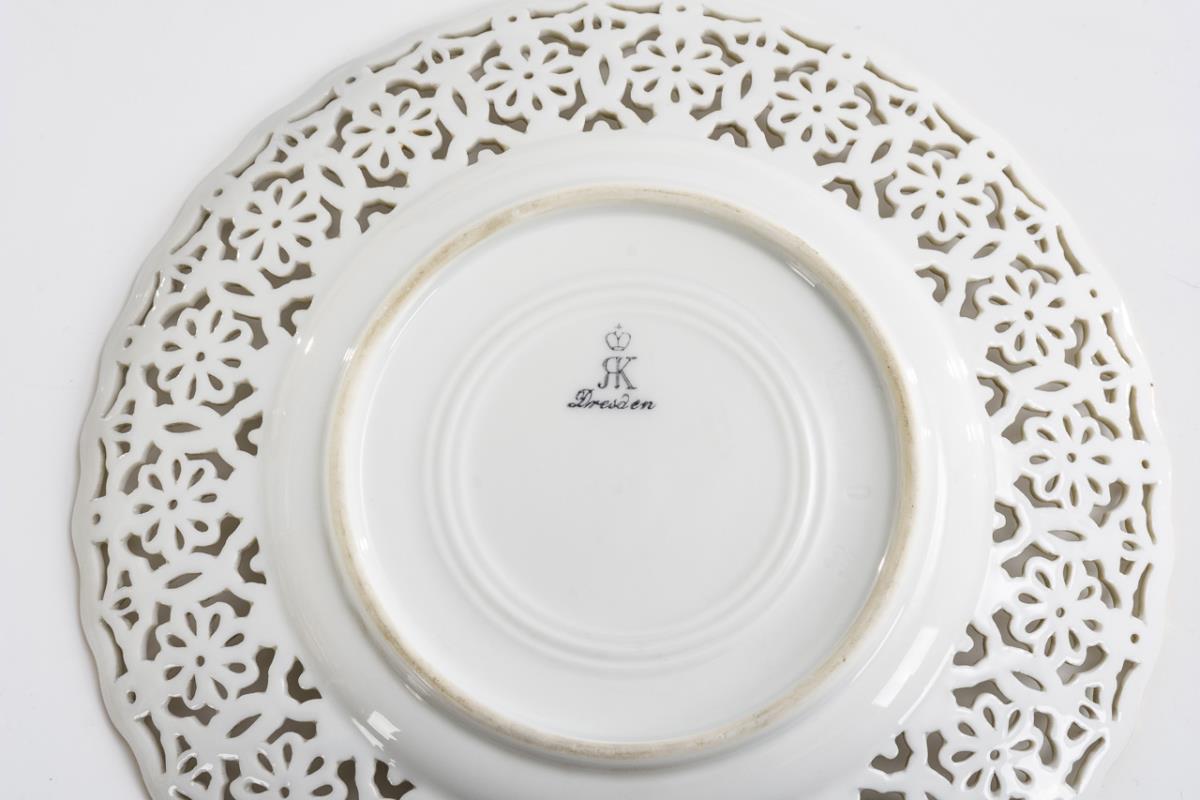 Dessert plate with floral openwork flag, in the mirror a bouquet of flowers.