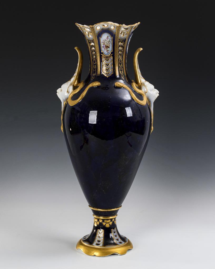 Tall, ovoid vase with two faun head handles flanked by snakes, pierced neck and round foot. Cobalt blue ground with gold veining. On the front a large cartouche set in a finely floral-ornamental gold-engraved frame depicting a round dance of putti with a faun sculpture.