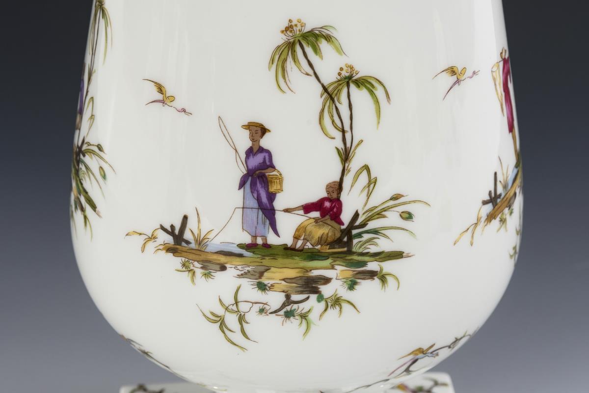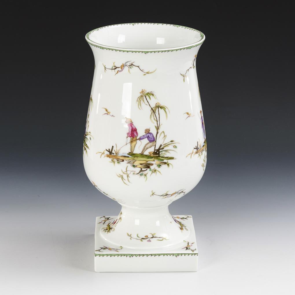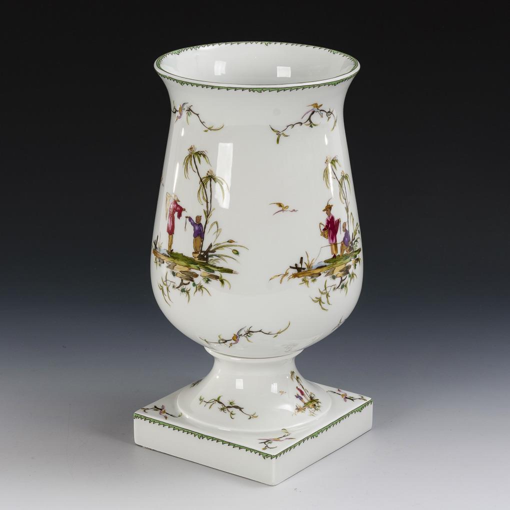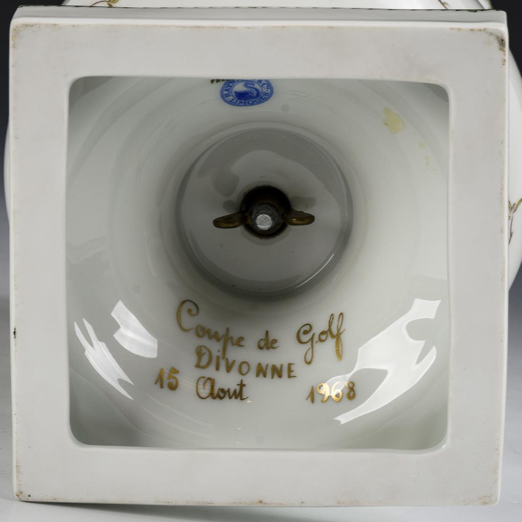 Baluster vase with round foot, on square plinth. Depiction of small Chinese scenes on the wall. Inscribed on the underside "Coupe des Golf DIVONNE 15 Aout 1968".