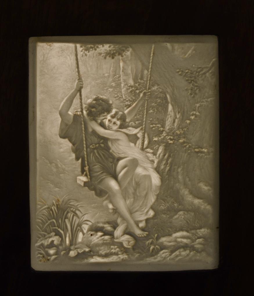1x wooden frame designed in the form of a portal with a small, inserted lithophane depicting a rocking couple (lithophane 9 x 7.5 cm; frame 39.5 x 32.5 cm). / 1x lithophane depicting a girl with a cat, framed in a lead glass frame (18.5 x 16.5 cm), with brass stand (H 18 cm). 1 glass pane defective.