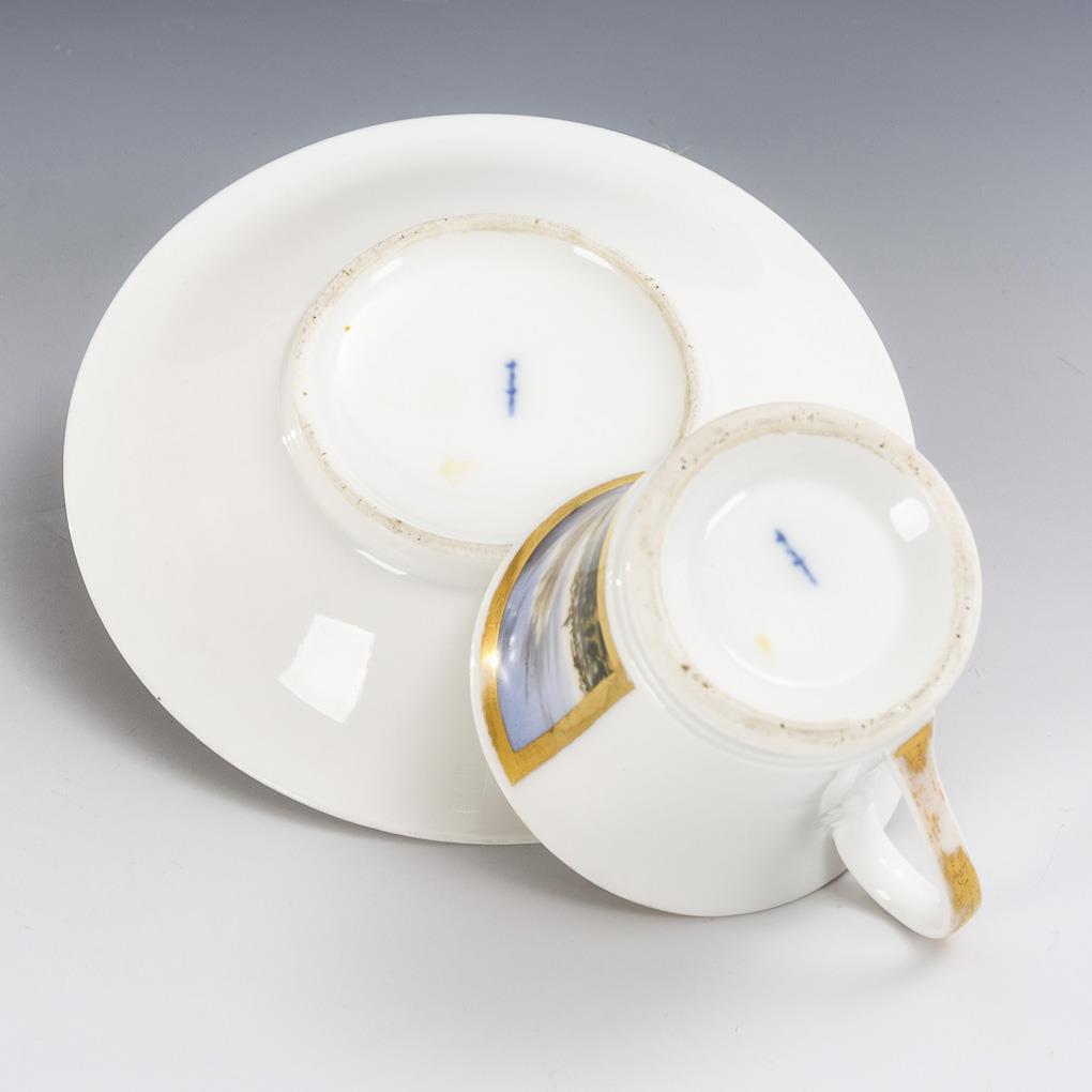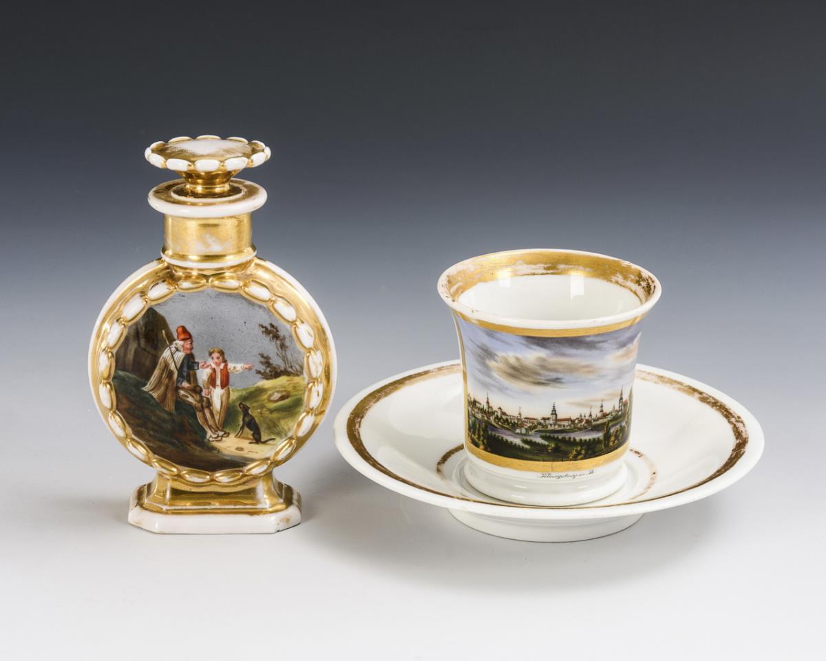 1x KPM Berlin, circa 1800: cylinder cup with crater rim and ear handle, inscribed view of Königsberg on the front (h cup 7.5 cm, Ø original saucer 15.5 cm). / 1x unmarked; around 1830/40: small flat bottle as a flask, on the front the depiction of a boy with grandfather and dog, verso landscape painting (h 13.5 cm). Gold rubbed.